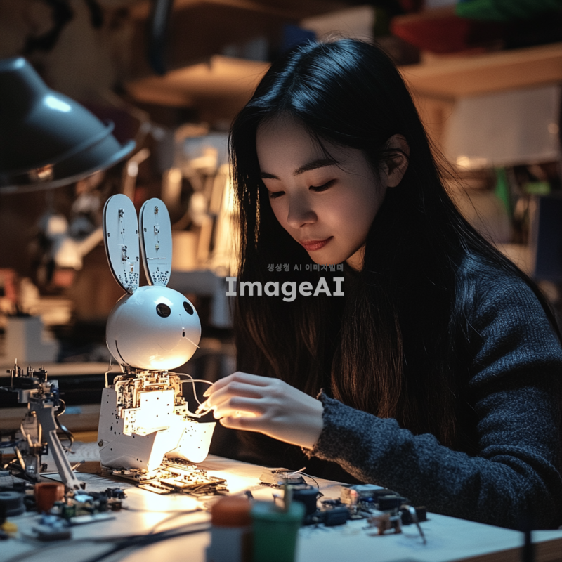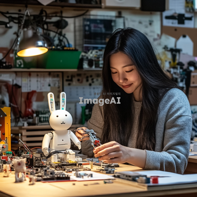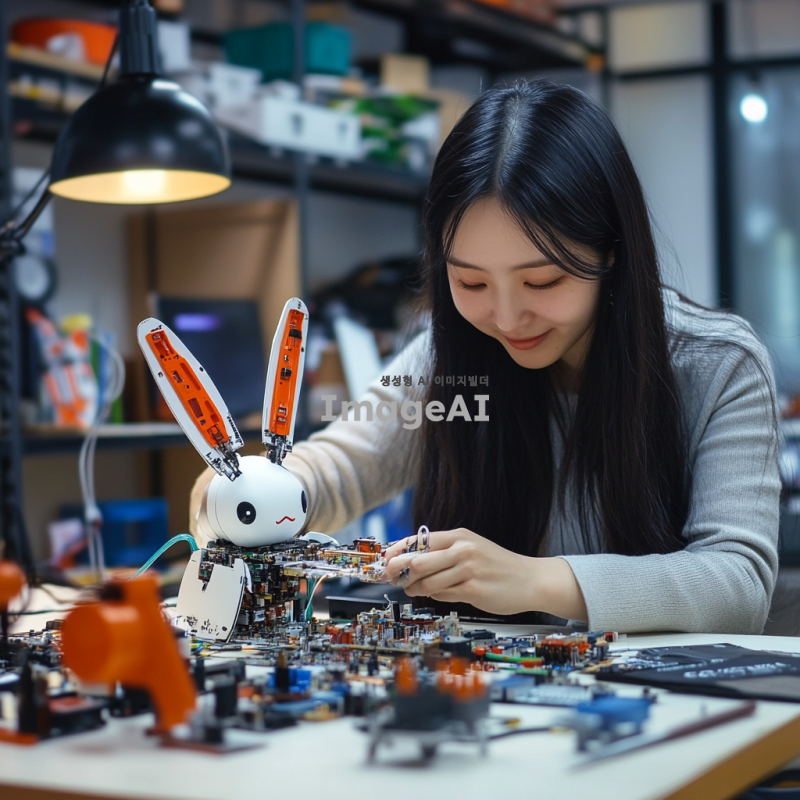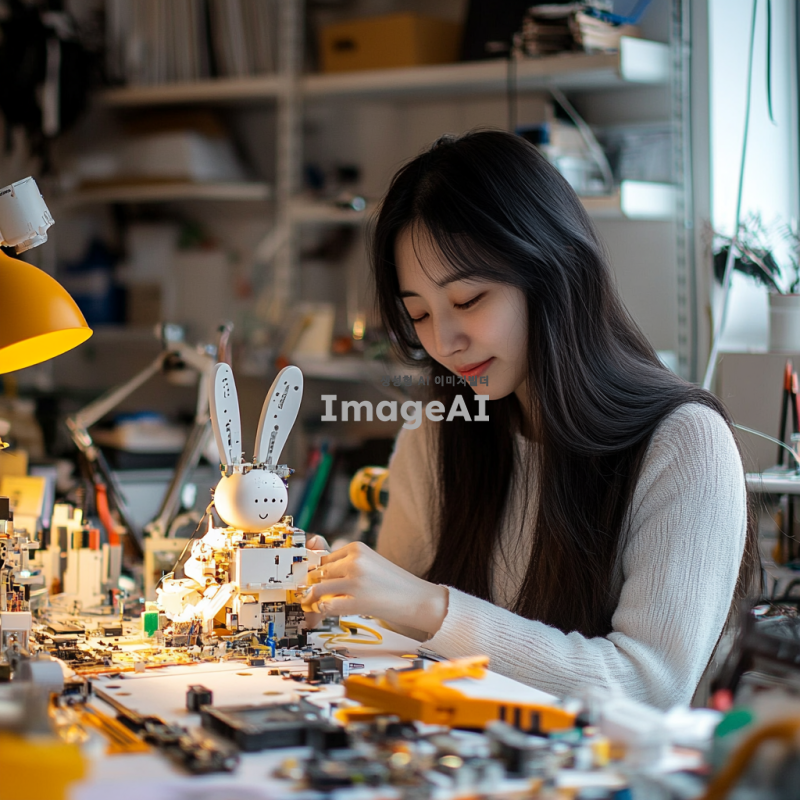 한국인 여성, 검은 긴 머리, 작업 테이블 앞, 고도의 집중, 토끼 모양의 로봇 부품 조립, 전자 공구와 부품들이 흩어져 있는 작업 공간, 현대적이고 깔끔한 실내, 따뜻한 조명, 기술적이고 창의적인 분위기, 로봇의 귀와 눈 부분 조립 중, 여성의 얼굴에 미소와 열정이 가득함.