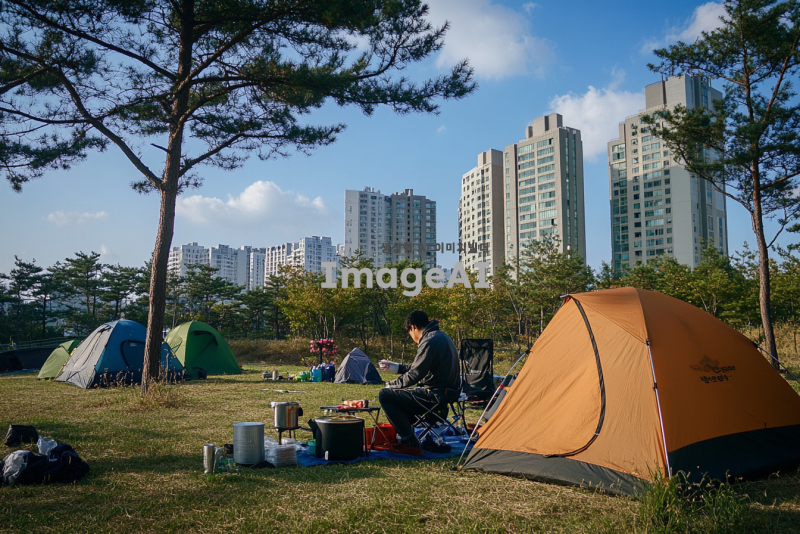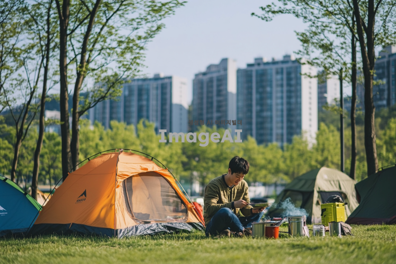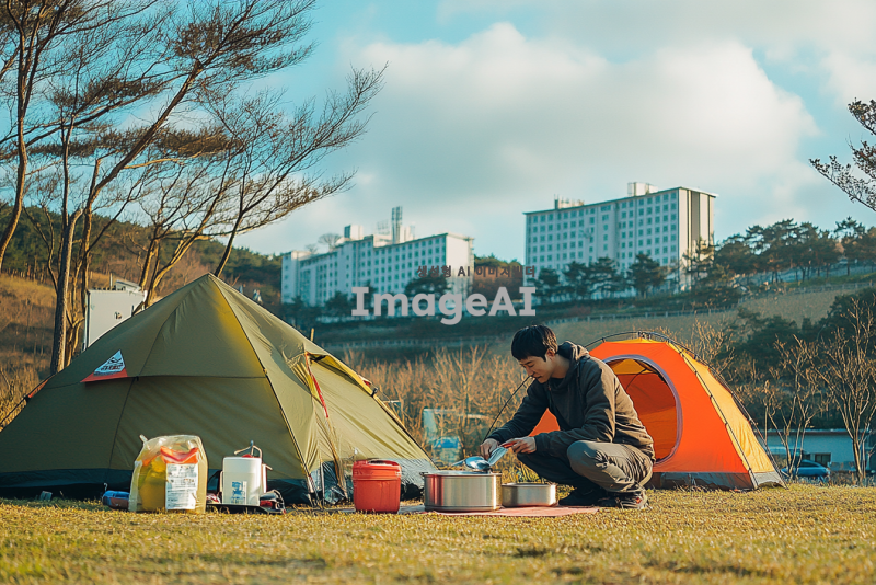 28살 한국인 남성이 국내 캠핑장에서 캠핑을 즐기는 장면, 푸른 하늘 아래 건물이 가득한 가운데 잔디 속에서 텐트와 캠핑 장비가 배치된 모습, 남성은 편안한 캐주얼 복장을 하고 있으며, 요리를 하고 있는 모습, 주변에는 나무와 잔디, 그리고 뒷 배경에는 건물이 어우러진 풍경