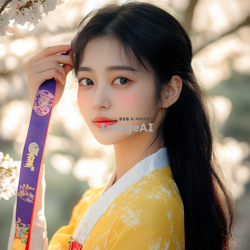 젊은 한국 여성, 배경은 화사한 봄날의 한국 정원, 부드러운 조명과 자연스러운 그림자, 전통적인 아름다움과 현대적인 감각이 어우러진 모습, 섬세한 디테일과 따뜻한 색감 강조 겨드랑이 강조.