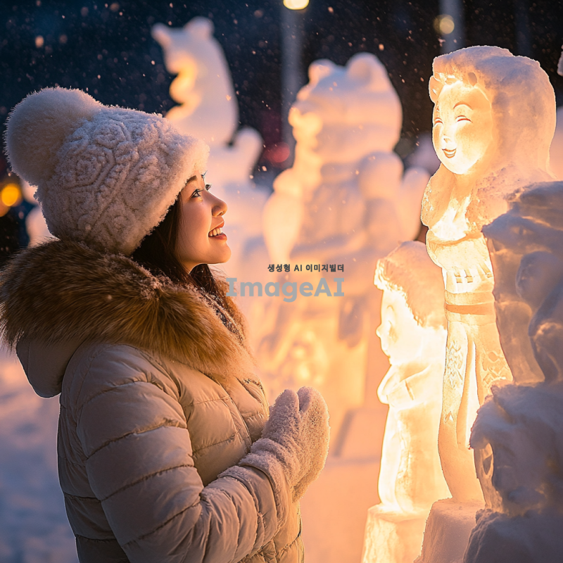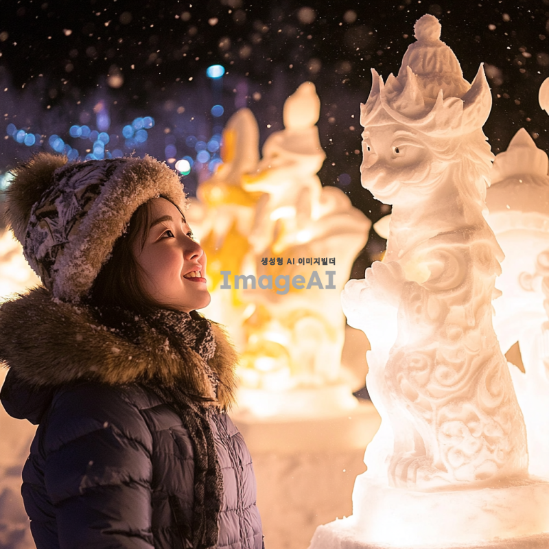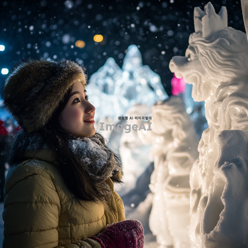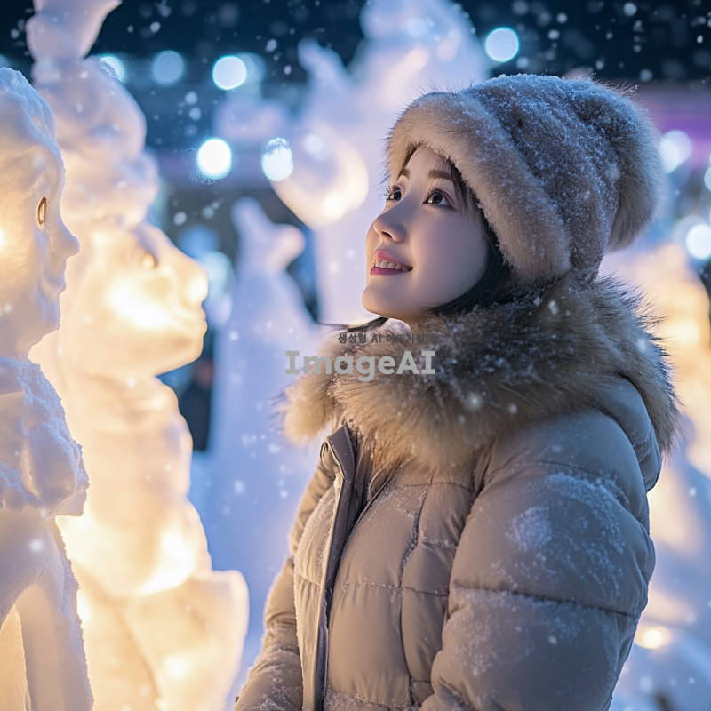 겨울철 눈축제에서 눈조각상을 감상하는 따뜻한 옷을 입은 한국인 여자의 모습. 그녀는 두꺼운 코트와 장갑, 털모자를 착용하고 있으며, 눈이 내리는 배경 속에서 감탄하는 표정을 짓고 있다. 주변에는 다양한 형태와 크기의 눈조각상들이 즐비하게 늘어서 있으며, 조명이 비춰져 반짝이는 모습이 인상적이다. 조각상들은 동화 속 캐릭터나 동물 모양으로 정교하게 만들어져 있다.