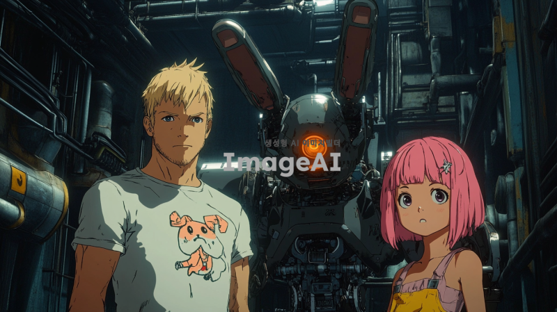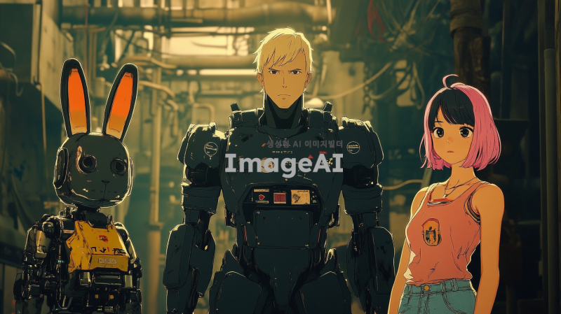 금발의 성인 남자는 진지한 표정으로 서 있고, 흑발 긴 머리의 성인 여자는 주위를 경계하며 서 있다. 분홍 단발 머리의 5살 여자 아이는 호기심 가득한 눈으로 주변을 살피고 있다. 토끼 외형의 전투형 로봇은 기계적인 디테일이 강조되어 있으며, 강력한 무기를 장착하고 있다. 이들은 모두 범죄조직의 본거지 안에 있으며, 주변은 어두운 조명과 복잡한 구조물들이 가득하다. 배경에는 낡은 벽과 금속 재질의 장비들이 어지럽게 놓여 있어 긴장감 넘치는 분위기를 자아낸다.