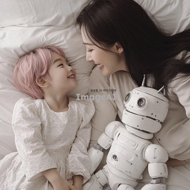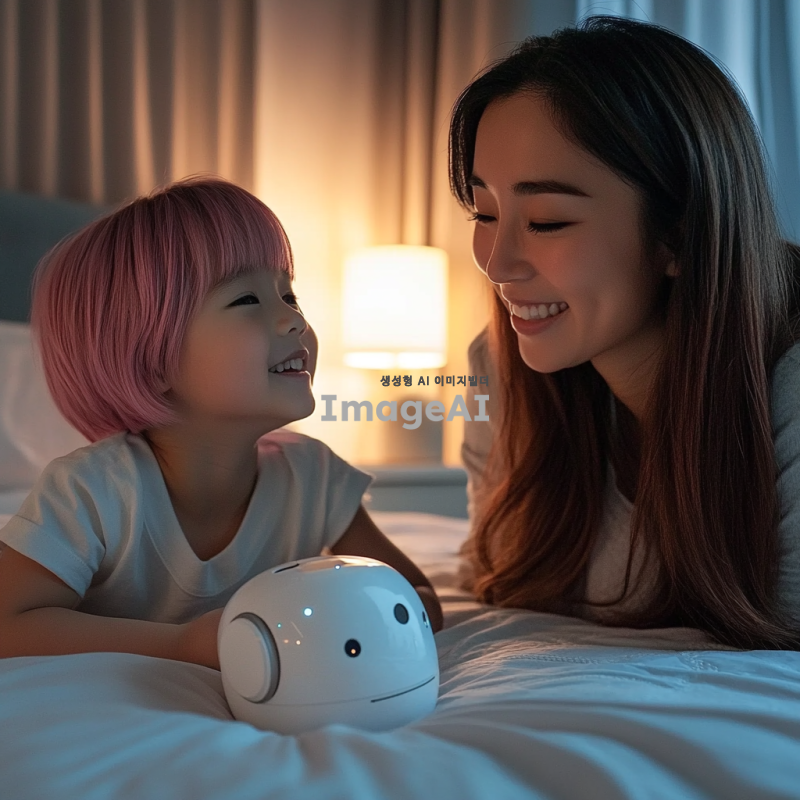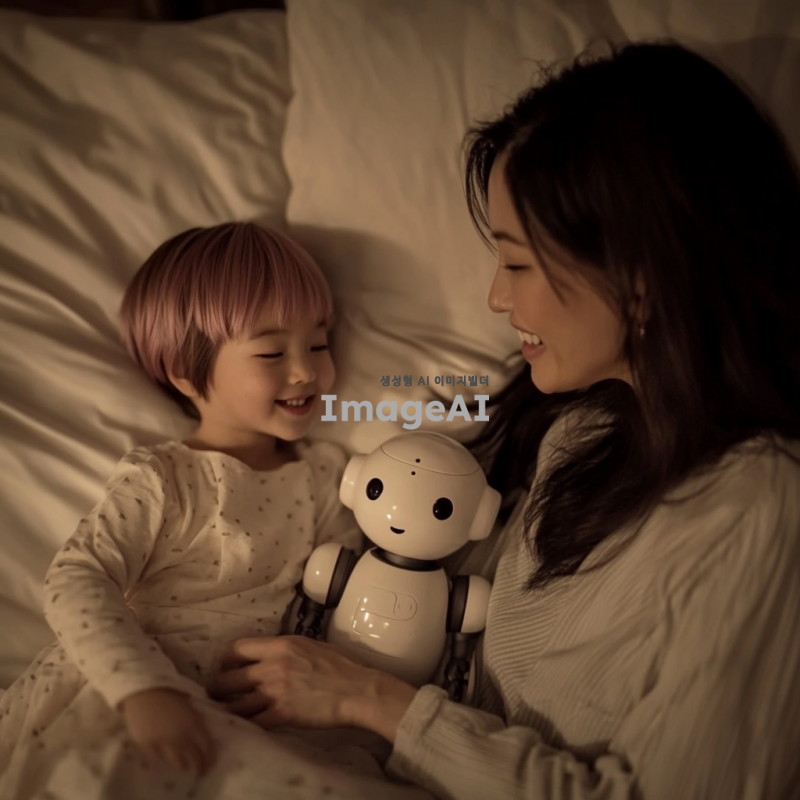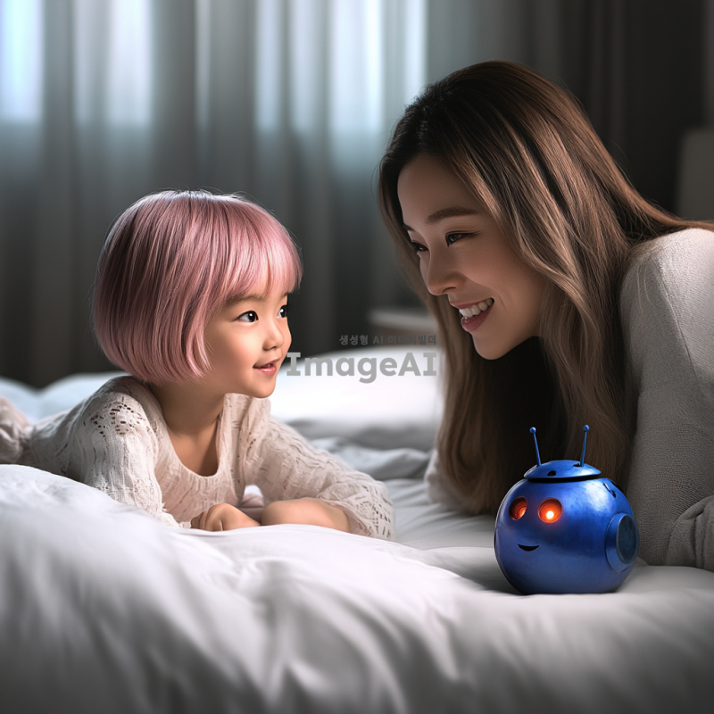 침대에 누워있는 분홍 단발 머리의 5살 여자아이와 토기 모양의 로봇, 긴 머리의 한국인 여자가 침대를 바라보며 미소 짓고 있는 장면. 침실은 아늑하고 따뜻한 밤의 분위기를 자아내며, 여자의 표정은 사랑스럽고 다정하며, 아이와 로봇은 편안하게 누워있는 모습이다.