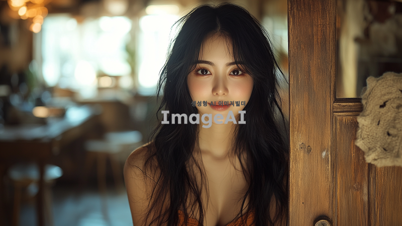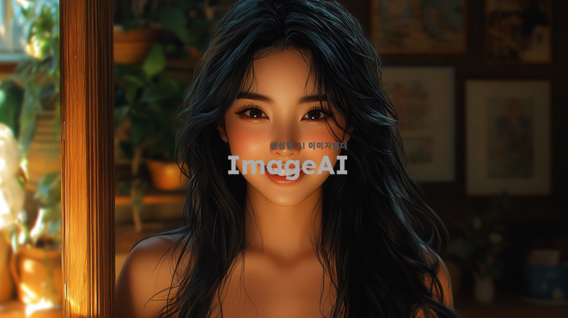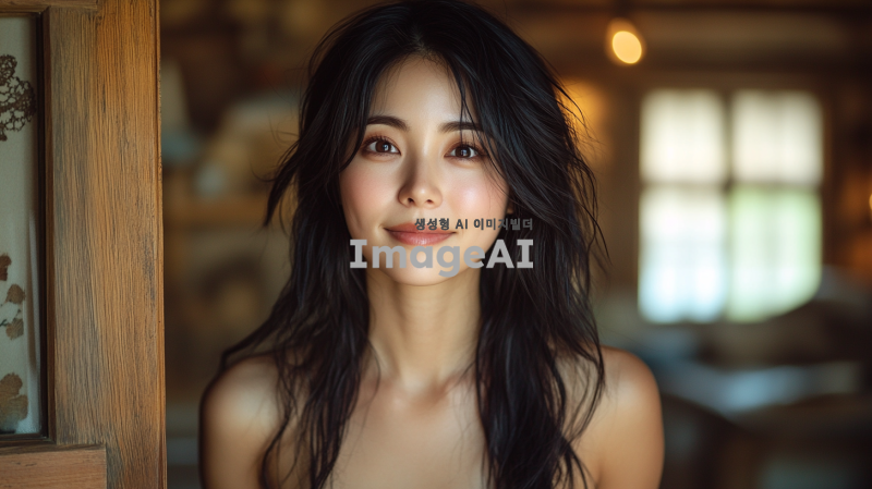 흑발의 긴 머리를 가진 성인 한국인 여성,여성이 나무로 된 방문을 닫고 나오면서 흐뭇한 미소를 짓고 있는 장면, 따뜻한 조명이 비추는 실내 공간, 여성의 얼굴에 부드러운 미소가 돋보이는 순간, 배경에는 아늑한 실내 장식이 어우러져 있는 장면. 전신이 보이게