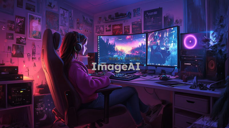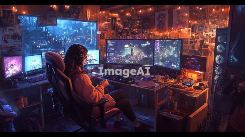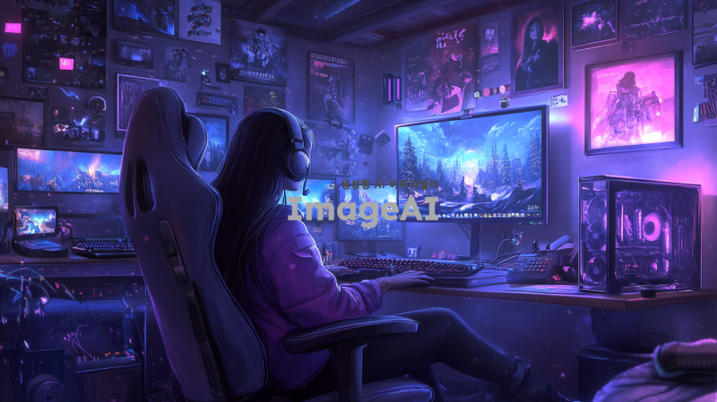 여자 게이머가 편안한 의자에 앉아 게임을 즐기고 있는 모습, 주변에는 다양한 게임 장비와 모니터가 배치되어 있으며, 방은 아늑하고 현대적인 스타일로 꾸며져 있다. 그녀는 헤드셋을 착용하고 집중한 표정으로 화면을 바라보고 있다. 방 안에는 은은한 조명이 비치고 있고, 벽에는 게임 관련 포스터가 걸려 있다.
