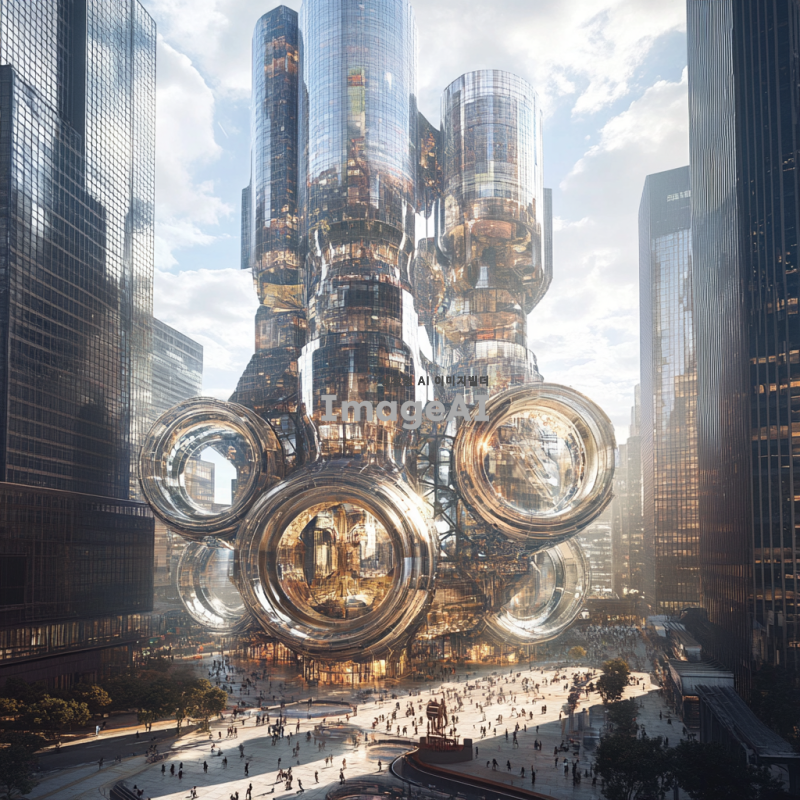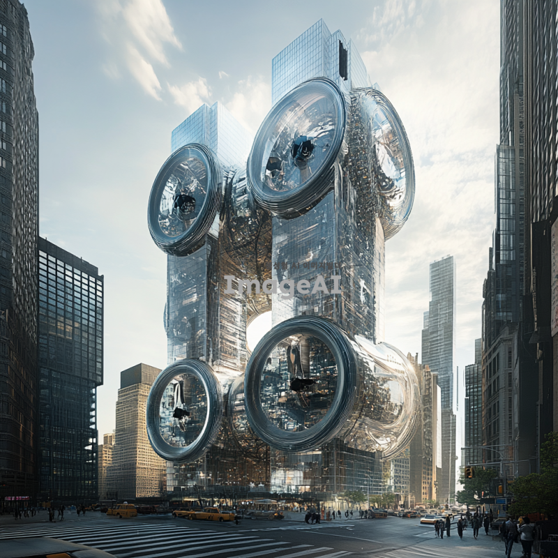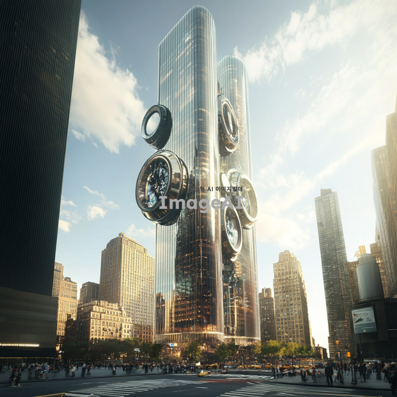 현대적이고 미래적인 디자인의 고층 빌딩, 큰 바퀴가 여러 개 달려 있고, 도시 풍경 속에서 움직이는 듯한 모습, 하늘은 맑고 구름이 약간 있는 날씨, 빌딩 외관은 유리와 금속 소재로 구성되어 있으며, 반사된 햇빛이 빌딩에 반짝이는 모습, 주변에는 다른 고층 건물들이 있으며, 길거리에는 사람들이 걷고 있는 모습, 전체적으로 활기찬 도시의 분위기, 창의적이고 혁신적인 느낌을 강조.