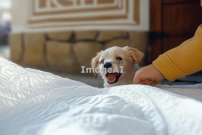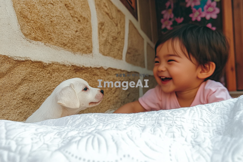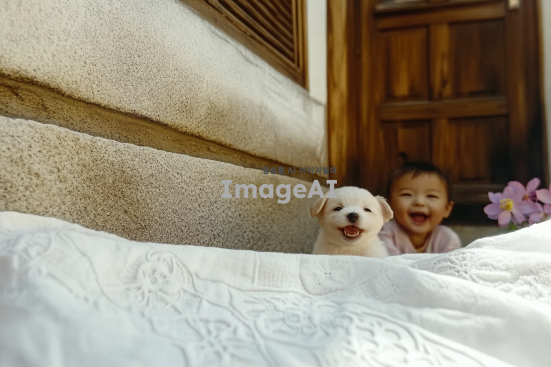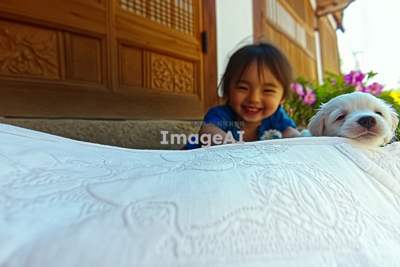 한국의 전통 한옥 마당에서 강아지와 함께 뛰어노는 어린아이, 하늘은 맑고 햇살이 따스하게 비추는 오후, 주변에는 아름다운 꽃들이 만발해 있고, 아이의 얼굴에는 밝고 행복한 미소가 가득하며 강아지는 아이 옆에서 즐겁게 꼬리를 흔들고 있는 장면.
