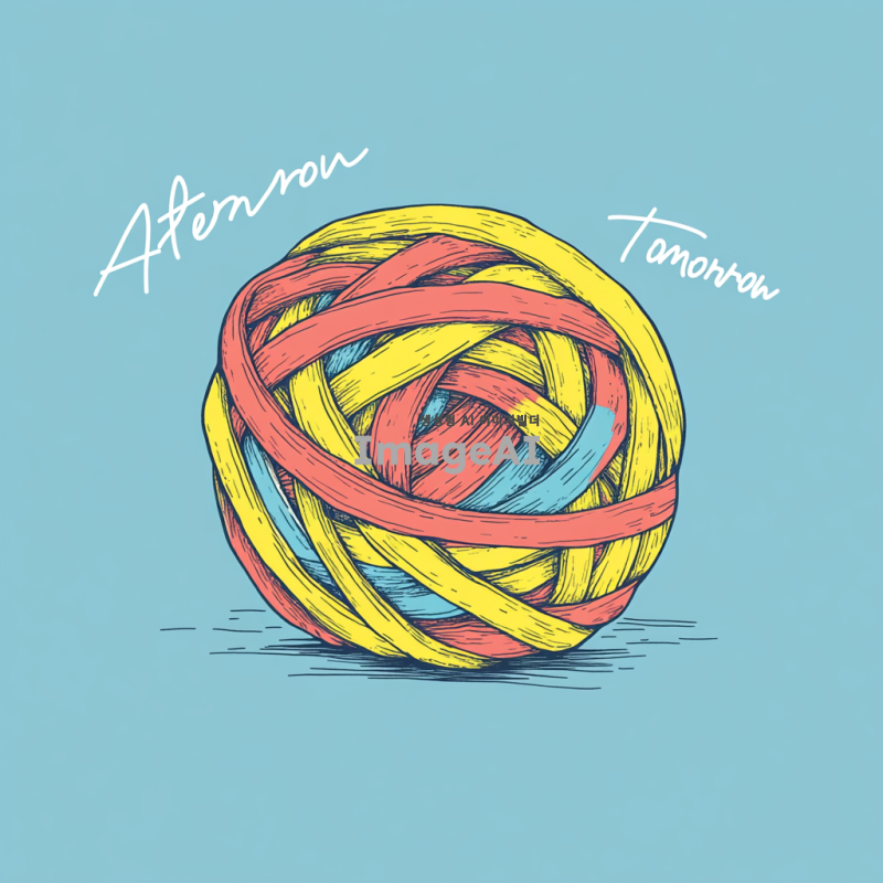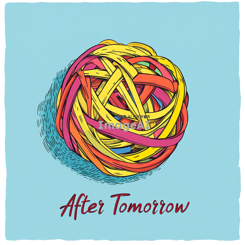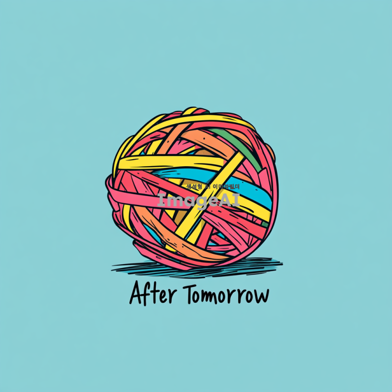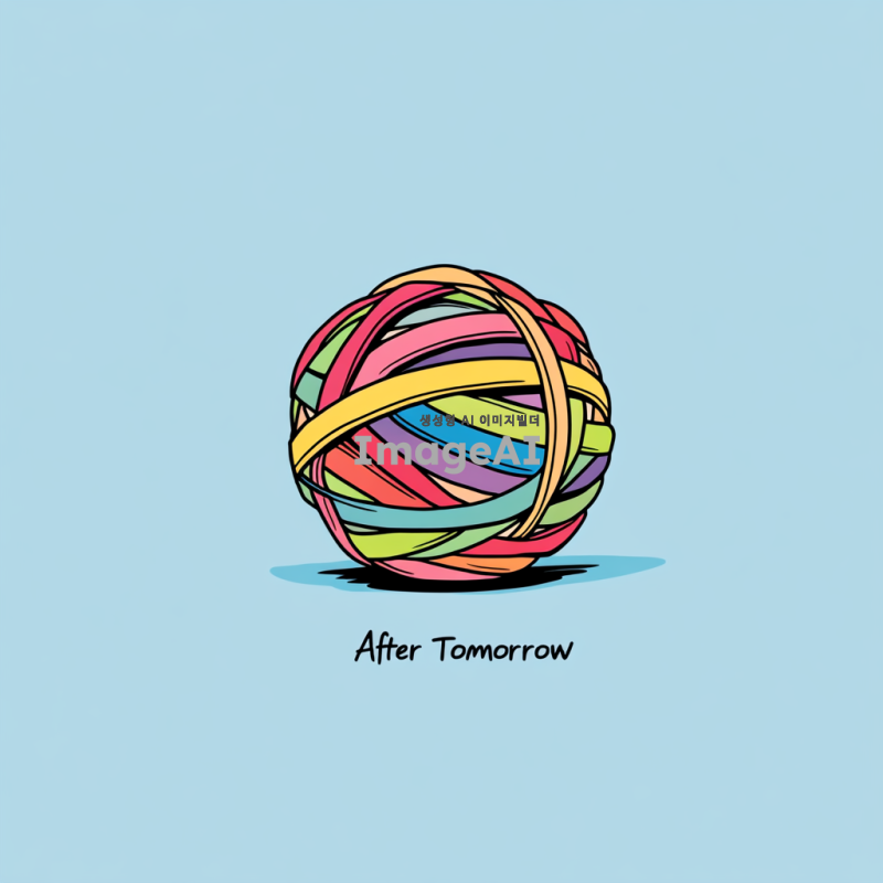 간단한 만화 스타일의 컬러풀한 고무줄 공이 연한 파란색 배경에 그려져 있으며, "After Tomorrow"라는 단어가 필기체로 쓰여 있습니다. 이 활기차고 미니멀한 디자인은 힙합 미학을 가지고 있으며 앨범 커버 아트로 사용될 수 있습니다.