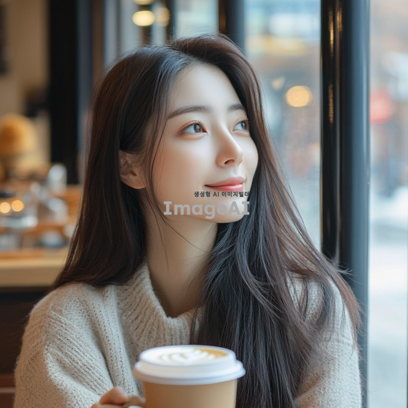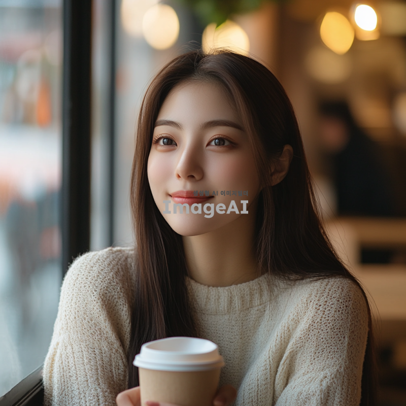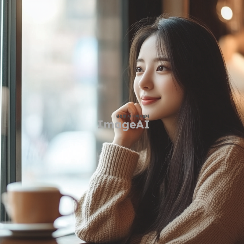 20대 한국 여성, 긴 생머리, 자연스러운 미소, 캐주얼한 옷차림, 도심의 카페에서 커피를 마시며 창밖을 바라보는 모습, 따뜻하고 아늑한 분위기, 부드러운 자연광이 얼굴을 비추는 장면.