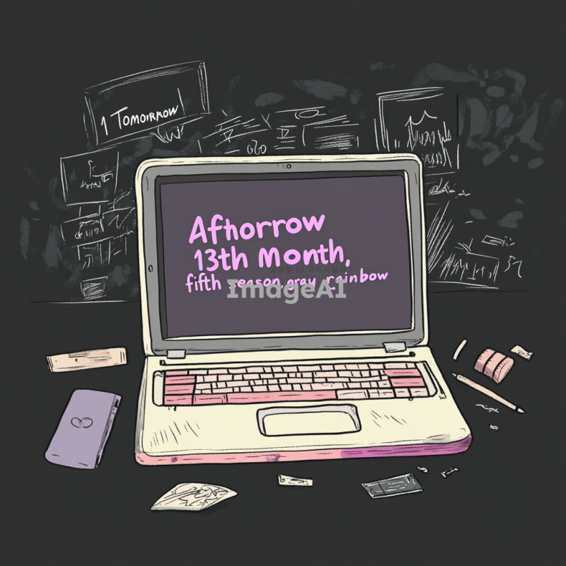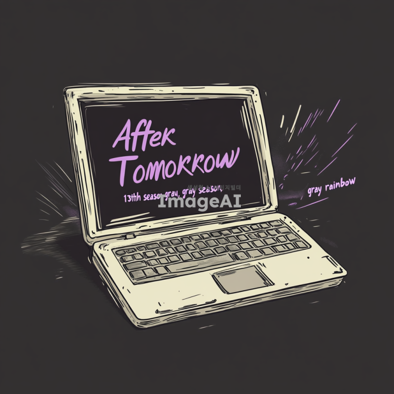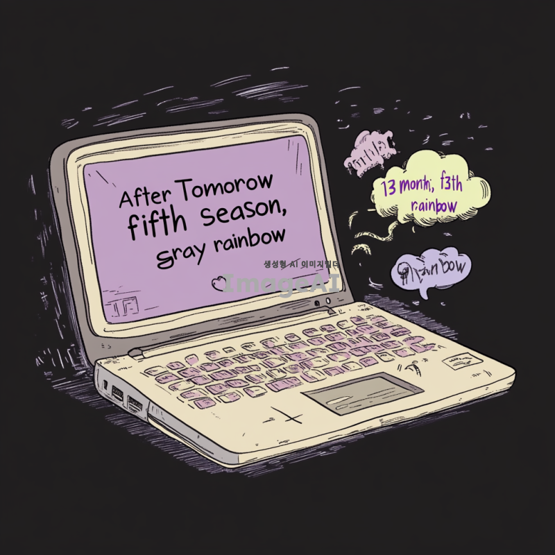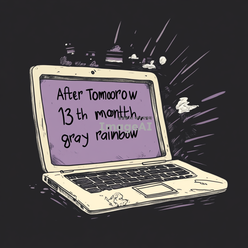 - "After Tomorrow"라는 단어가 적힌 열린 노트북의 만화 그림과 검은 배경에 보라색 연필로 그린 "13월", "다섯번째 계절", "회색빛 무지개", 커버 아트 스타일, 미니멀리즘, 애니메이션 스타일, 검은색, 흰색, 베이지색이 사용되었습니다.