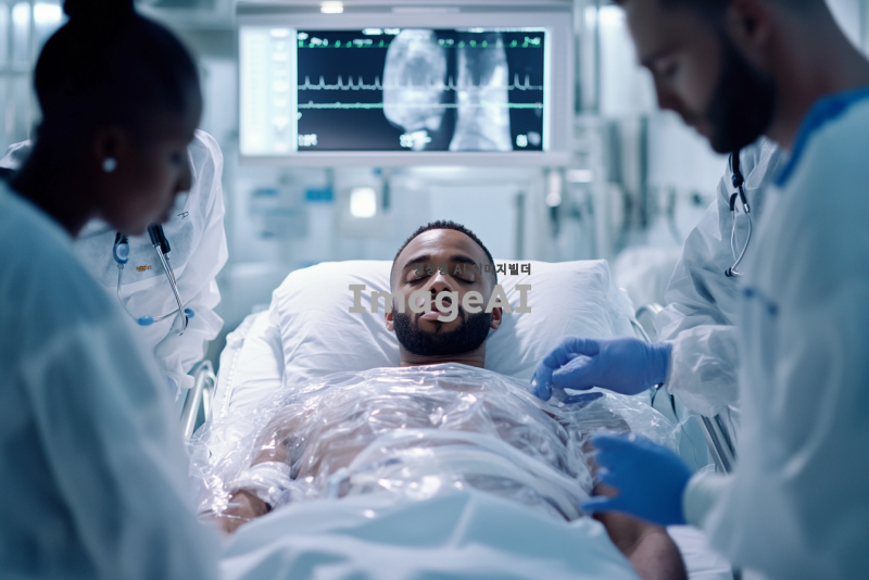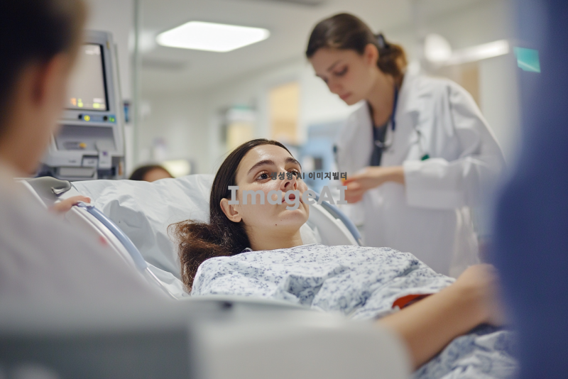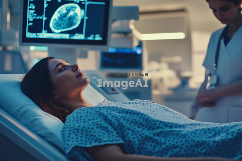 병원 검사실에서 간 담도 스캔 검사를 받는 환자, 병원 가운을 입고 검사 기계에 누워 있는 모습, 환자의 표정은 차분하고 편안한 느낌, 주변에 의료진이 전문적인 태도로 환자를 돕고 있는 장면, 현대적인 병원 환경, 깨끗하고 밝은 조명.