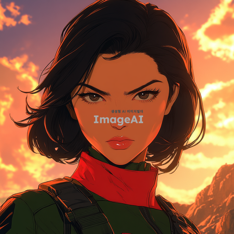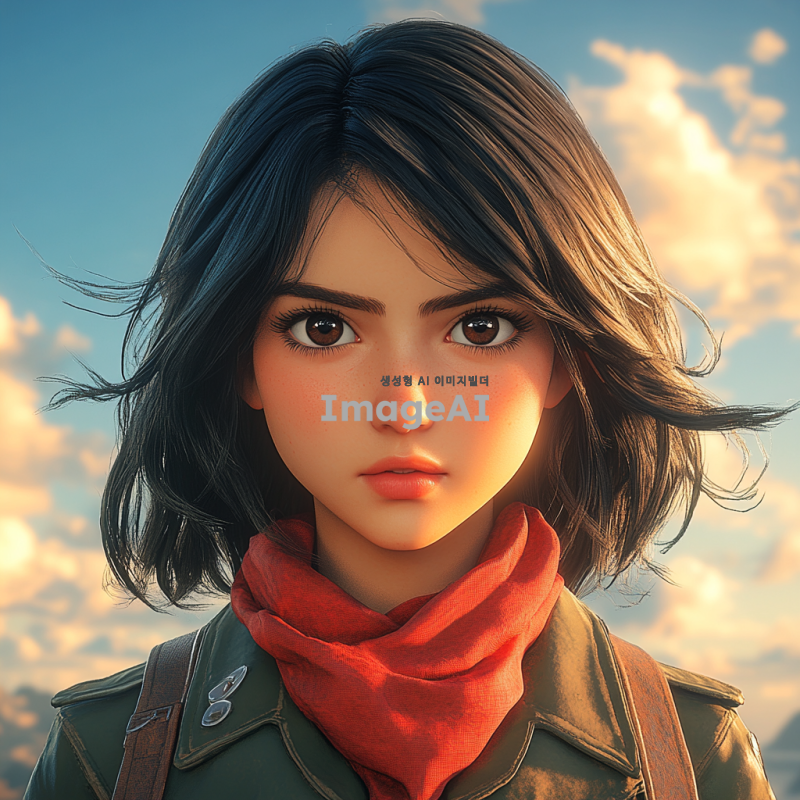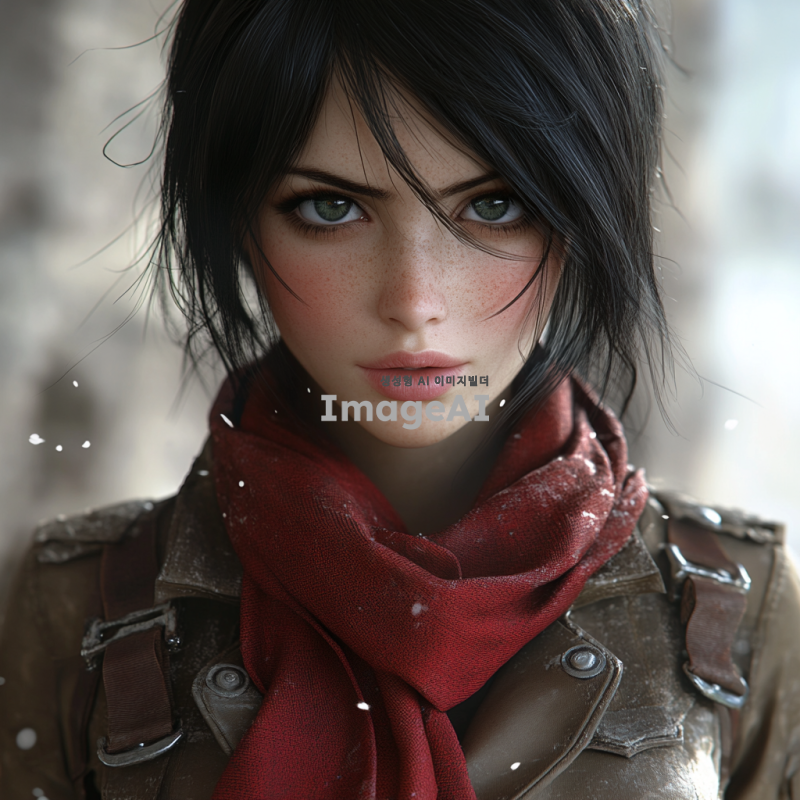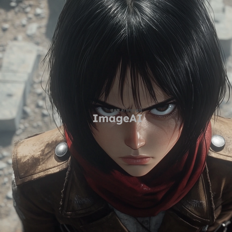 애니메이션 스타일로 묘사된 미카사 아커만, 짙은 검은 머리카락이 어깨까지 내려오며, 강렬한 눈빛과 날렵한 체격을 강조, 그녀의 상징적인 빨간 목도리와 군복을 입고 있으며, 입체 기동 장치를 착용한 모습, 배경은 황혼이 지는 하늘과 웅장한 벽이 어우러진 장면, 역동적이고 긴장감 넘치는 포즈로 전투 준비 자세를 취하고 있는 모습.