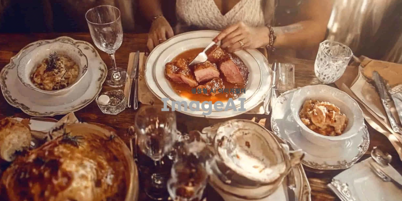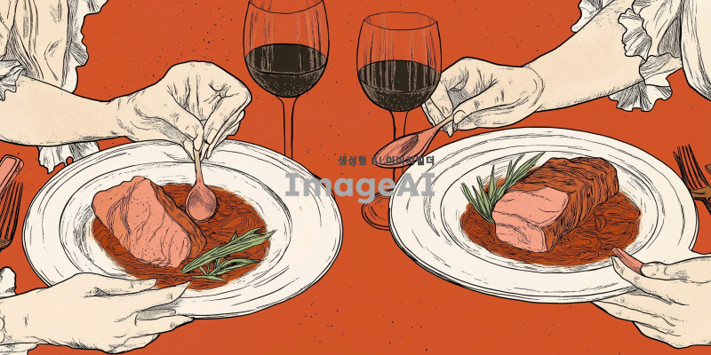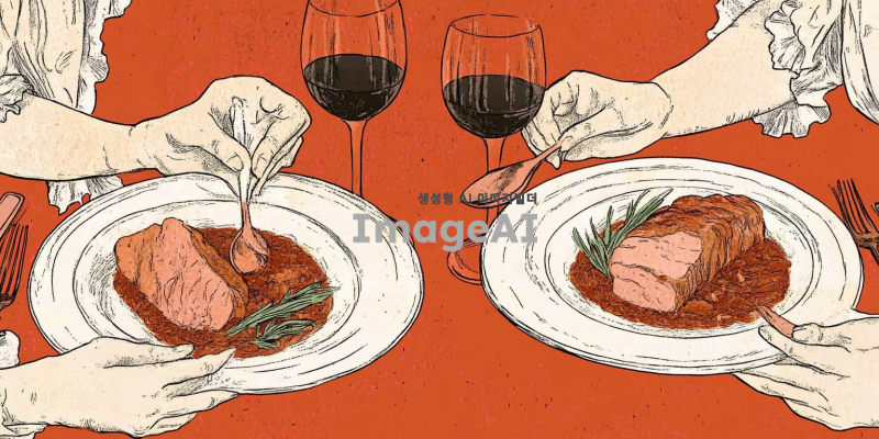 테이블 위에 삼겹살과 뚝배기찌개가 놓여 있는 장면, 단둘이서 마주보며 식사, 목까지만 보이는 그림