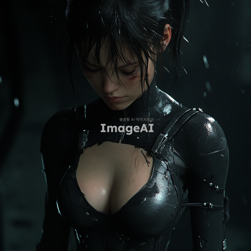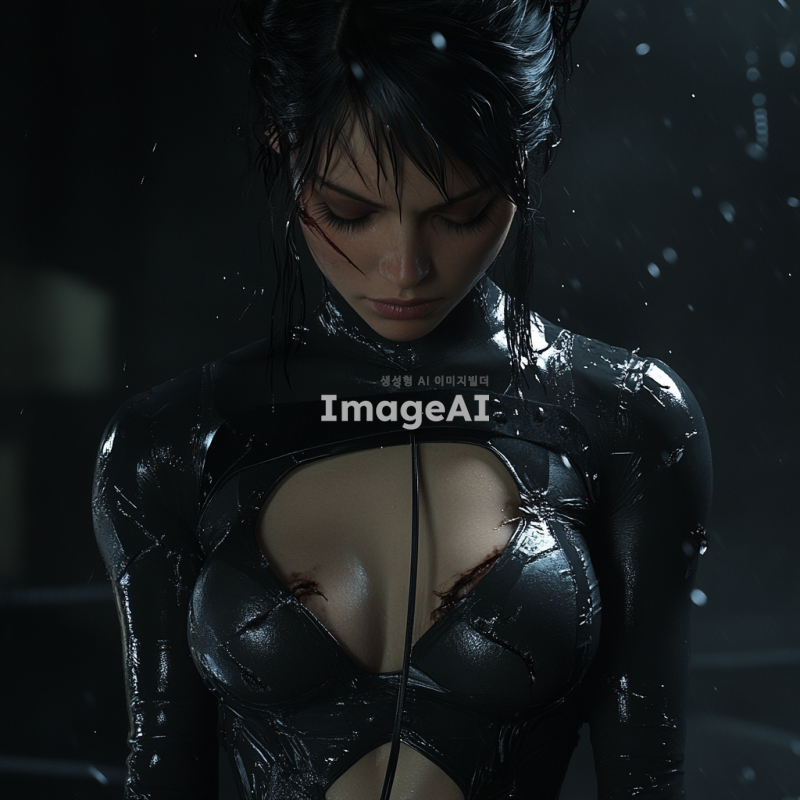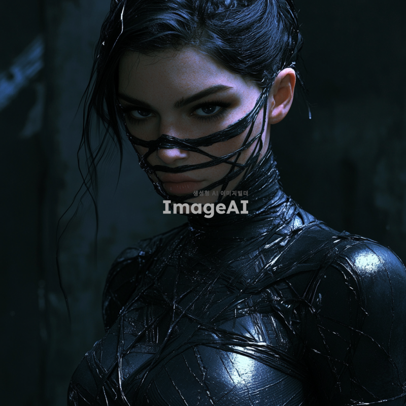 어두운 배경 속에서 검은색의 찢어진 타이트한 슈트를 입은 여성 히어로가 온몸이 묶여 있는 모습, 얼굴은 마스크 없이 잘 드러나고 있으며, 긴장감이 느껴지는 표정, 슈트의 디테일과 질감이 강조된 장면, 주변에는 약간의 그림자와 빛의 대비가 있어 긴박한 분위기를 연출.