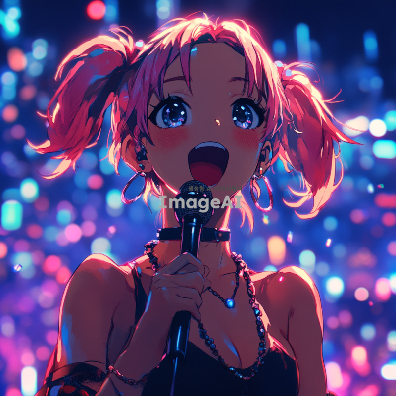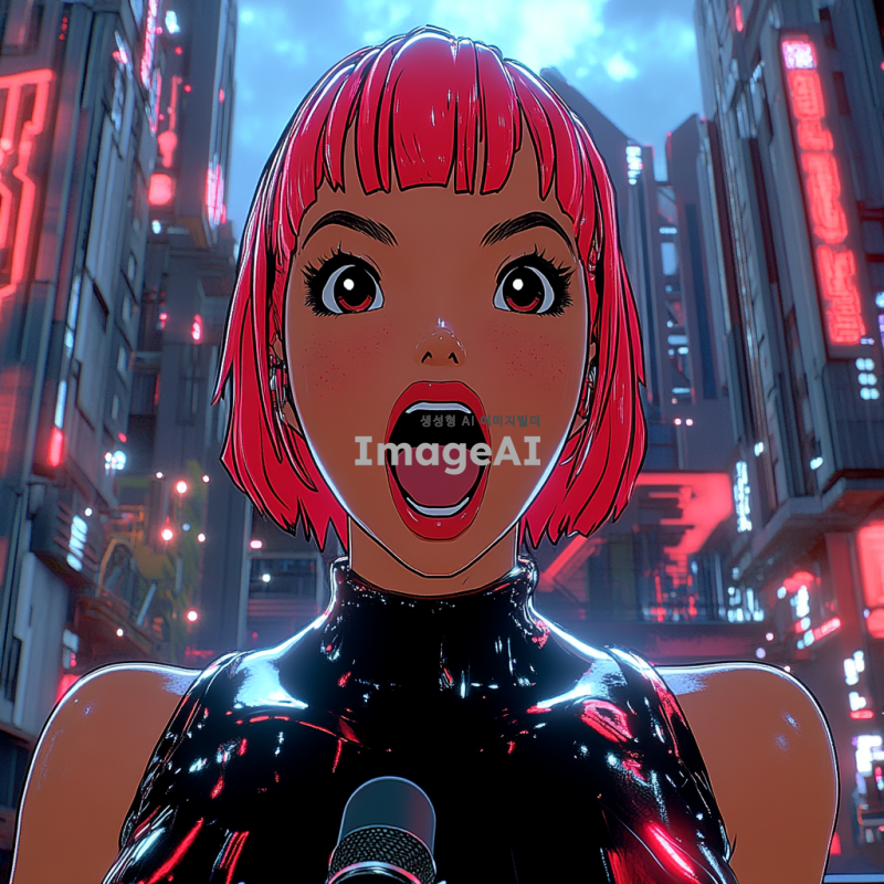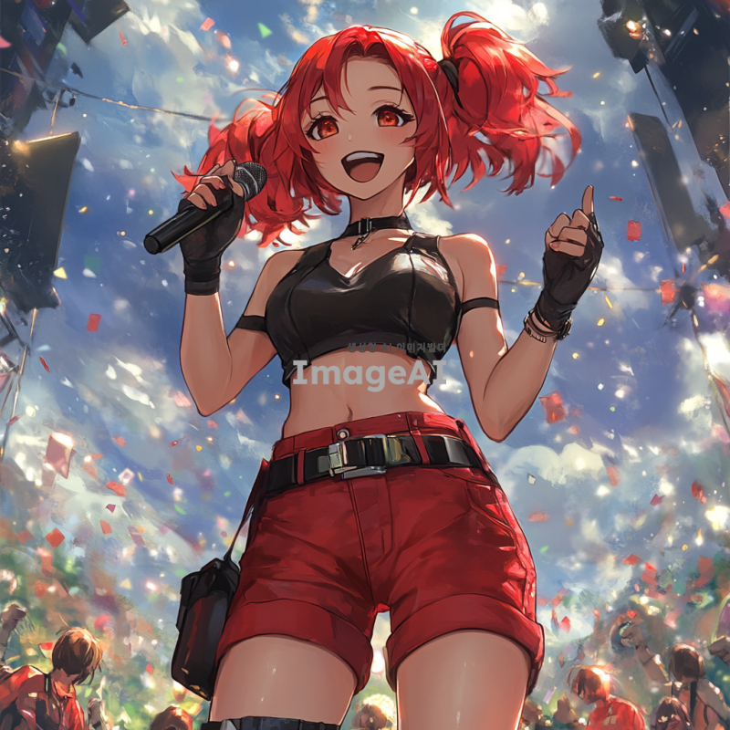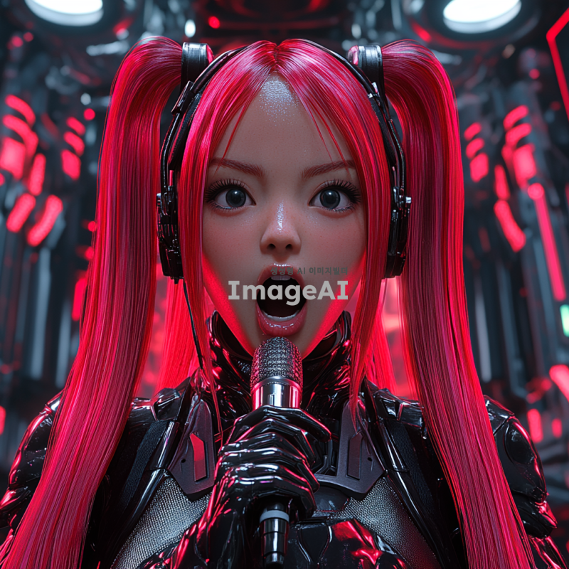 카사네 테토, 붉은색 트윈 테일 헤어스타일, 밝고 발랄한 표정, 검은색과 빨간색이 조화된 의상, 마이크를 들고 노래하는 모습, 미래적인 무대 배경, 환상적인 조명 효과, 애니메이션 스타일, 생동감 있는 분위기.