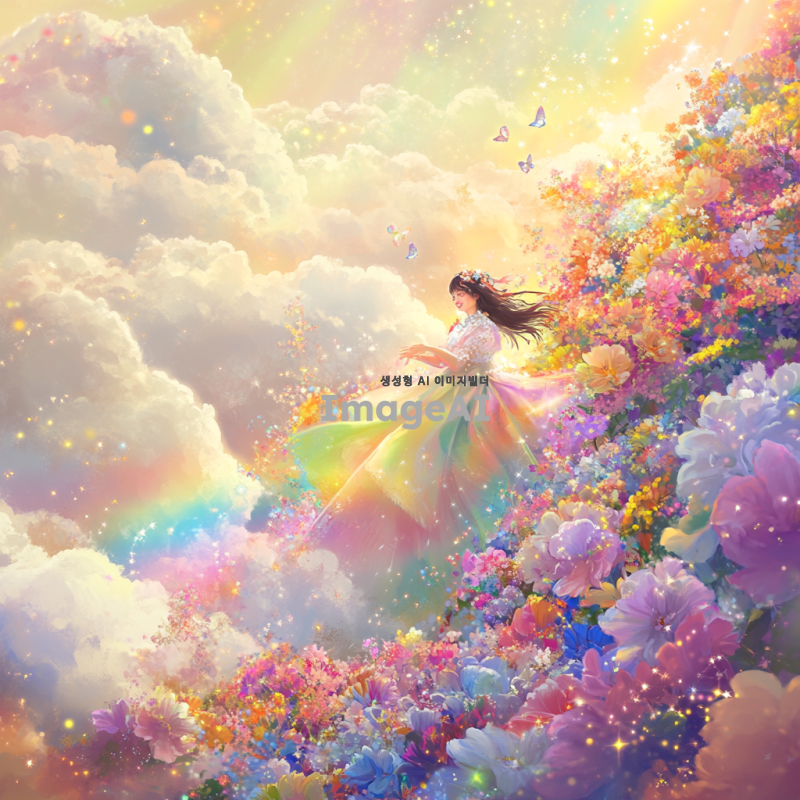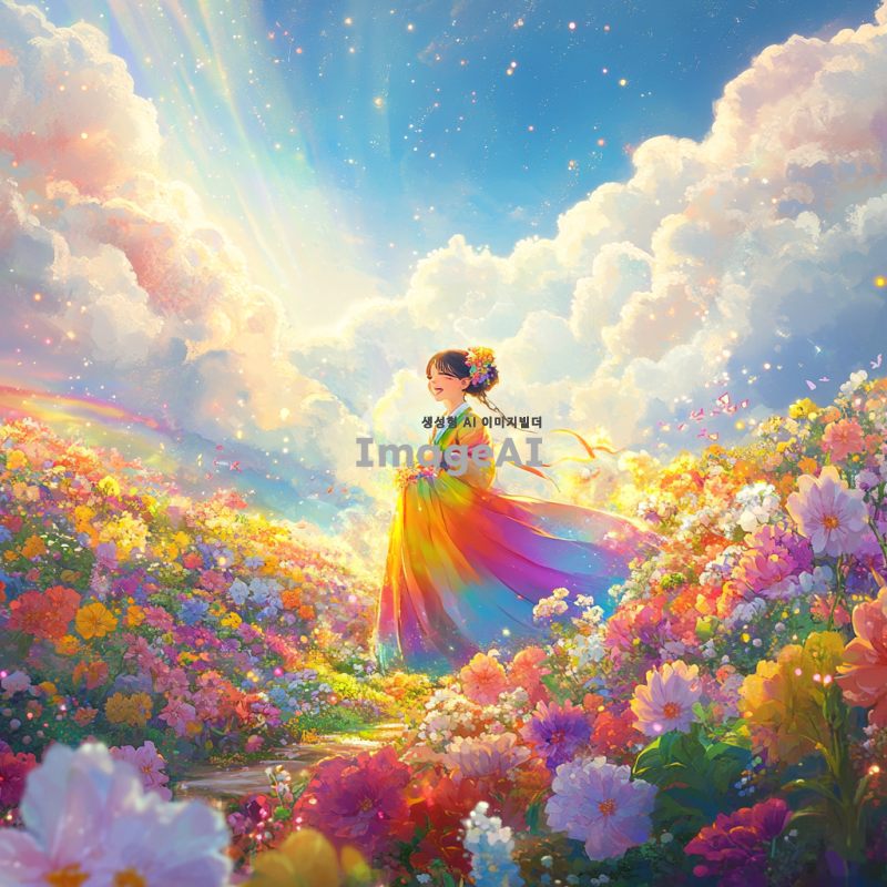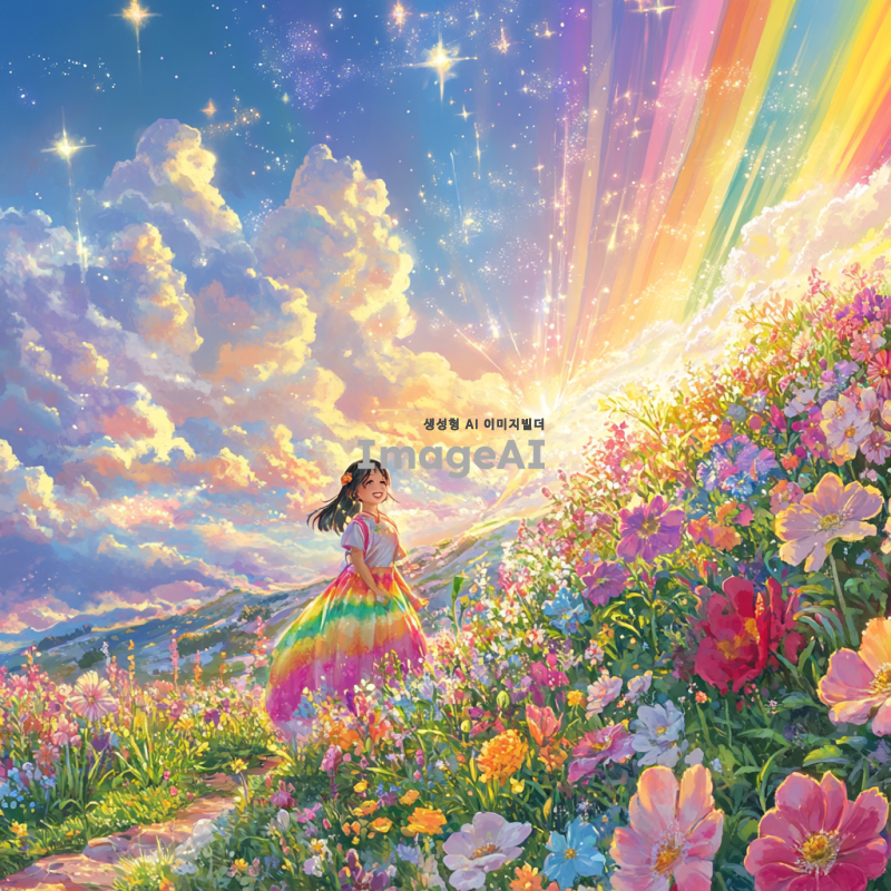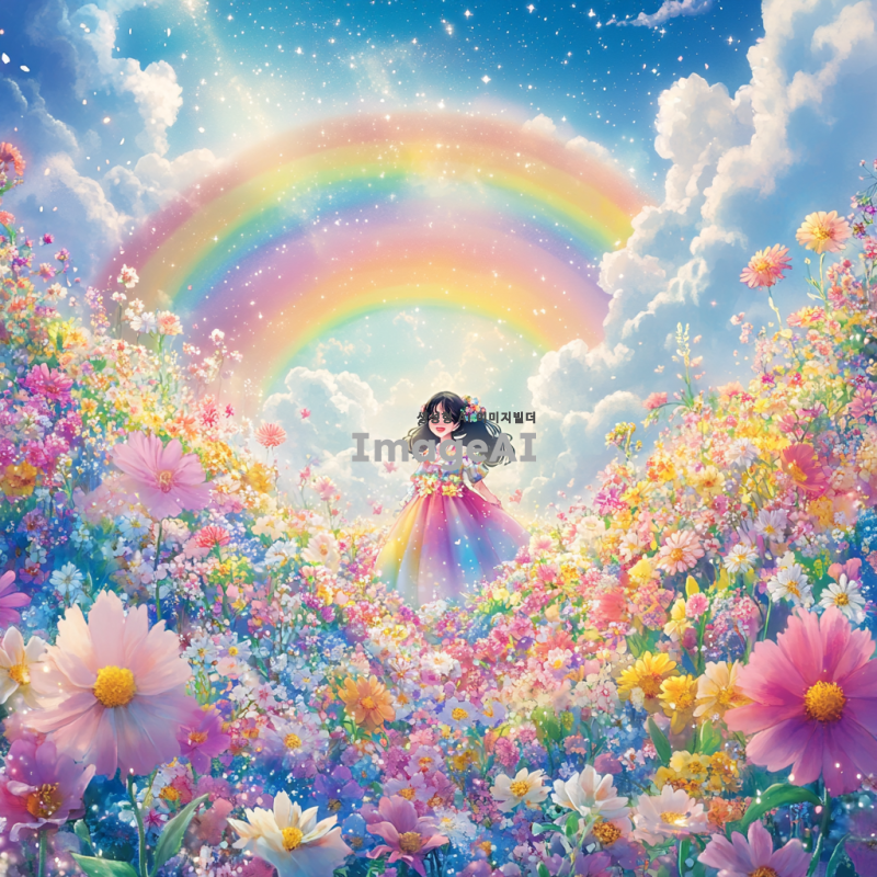 밝고 화사한 무지개색 배경에 다양한 크기의 반짝이는 별들이 흩어져 있는 장면, 중심에는 환하게 웃고 있는 한국인 소녀가 무지개빛 드레스를 입고 서 있으며, 그녀의 주변에는 다채로운 색상의 꽃들이 만개해 있는 모습, 하늘에는 부드러운 구름이 떠다니고, 따뜻한 햇살이 은은하게 비추는 풍경.