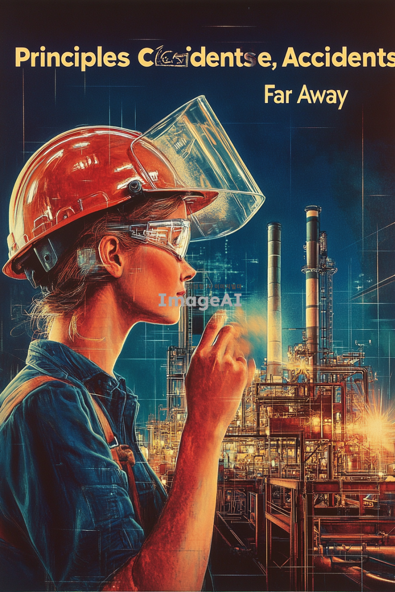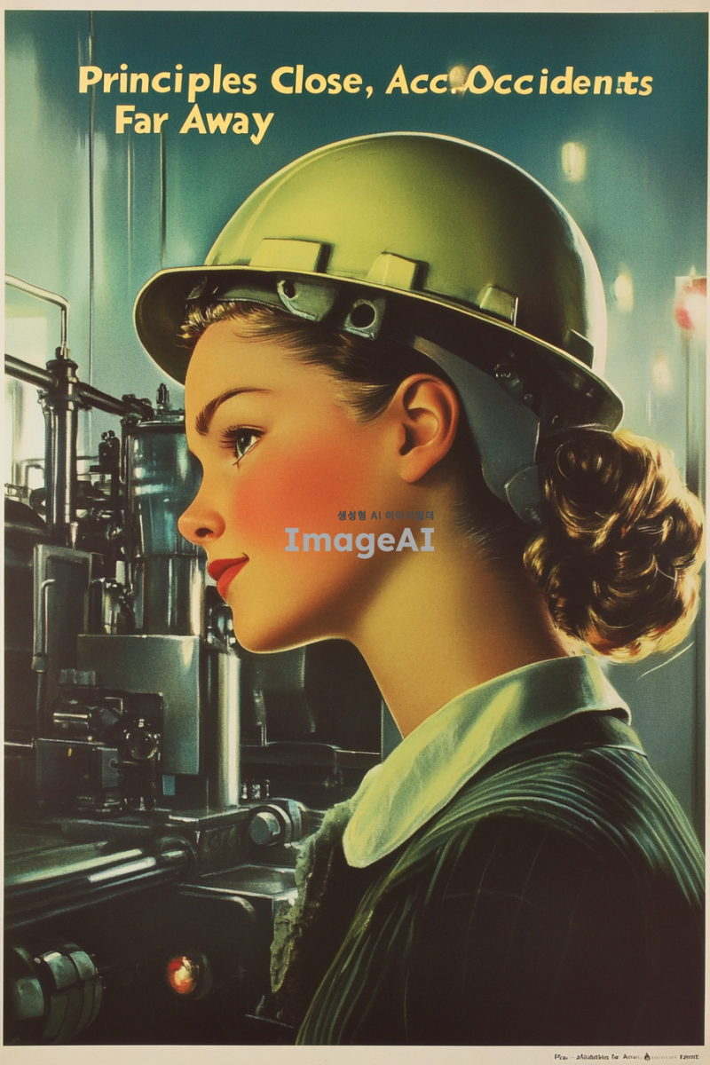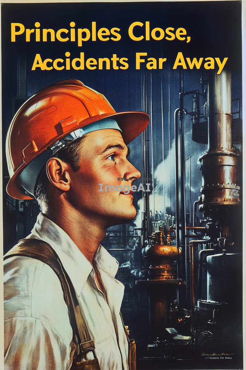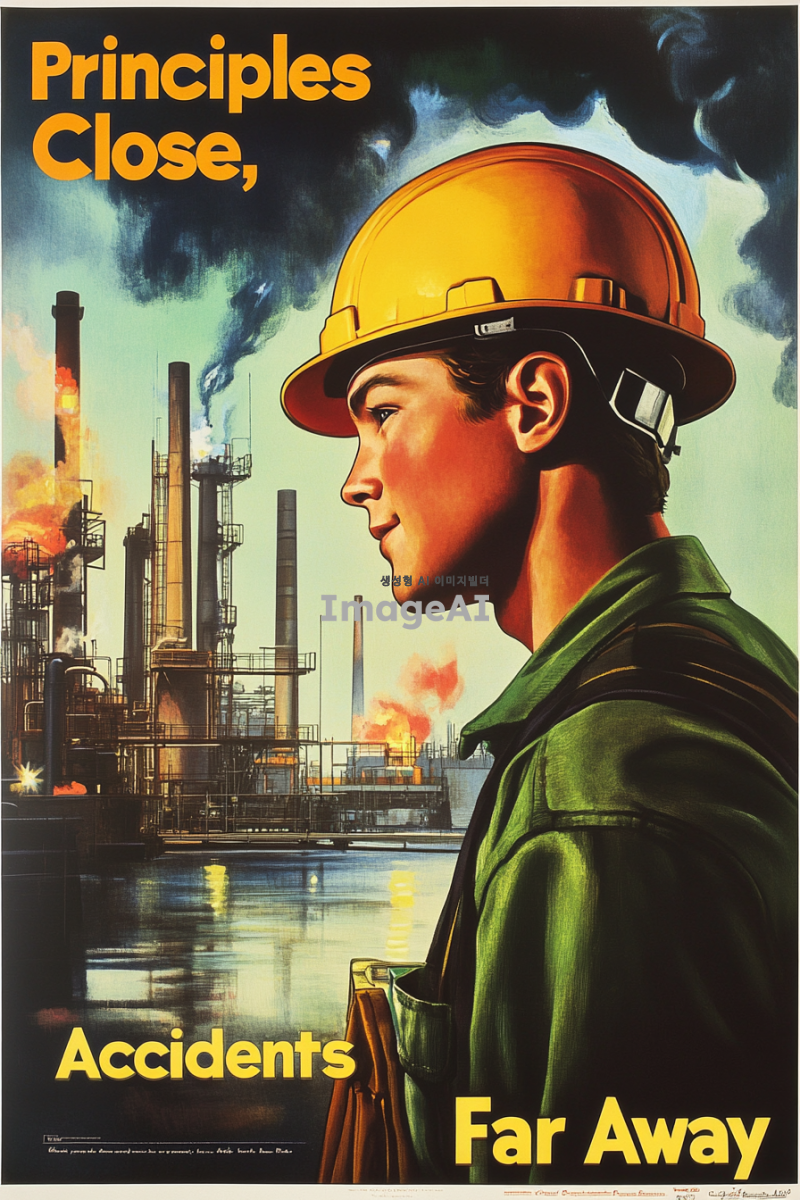 산업 현장에서 안전모를 착용한 작업자가 안전 수칙을 지키며 일하는 모습, 배경에는 공장 설비와 기계들이 안전하게 운영되고 있는 장면, 포스터의 상단에는 "원칙은 가까이, 사고는 저 멀리"라는 문구가 강조되어 있는 디자인, 밝고 긍정적인 분위기, 안전과 예방의 중요성을 강조하는 요소들 포함
