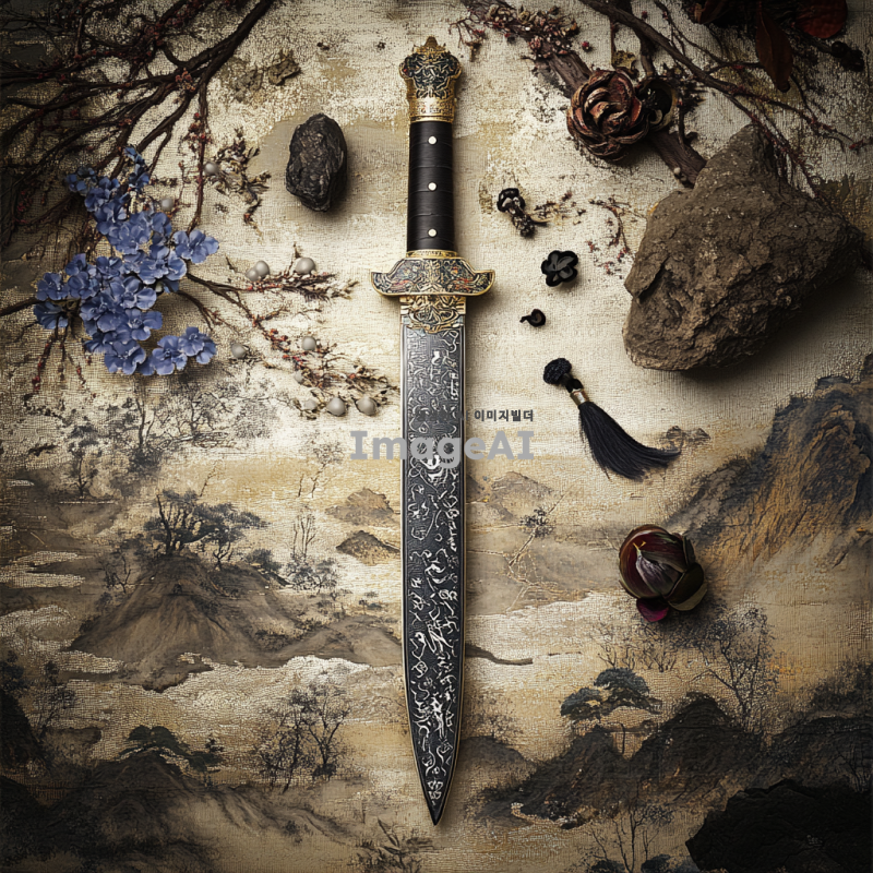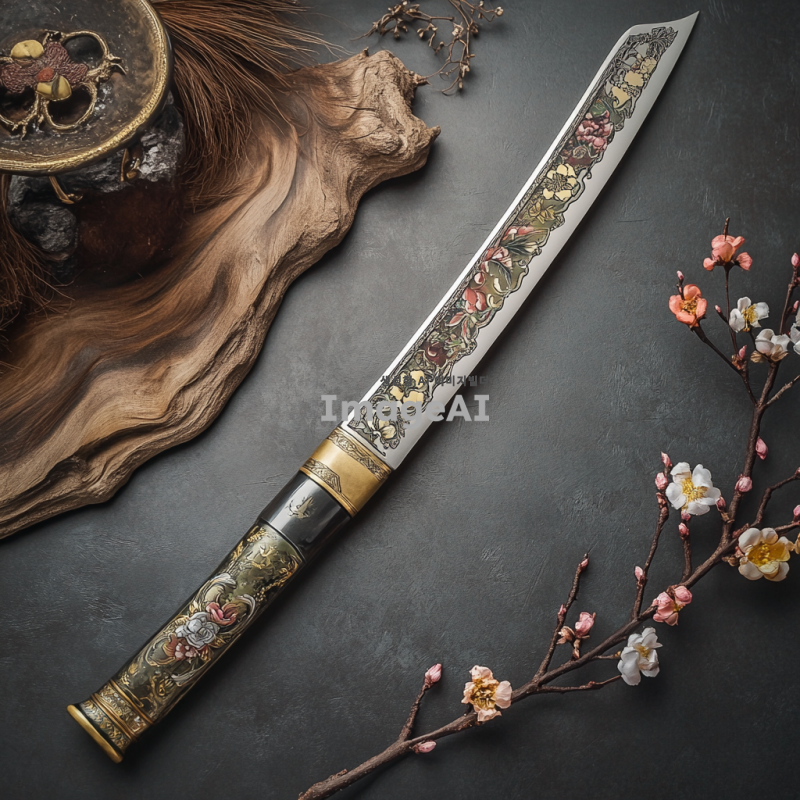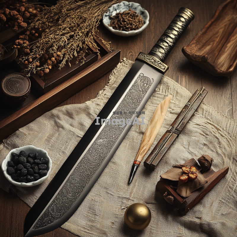 고대 한국의 전통 무기인 칠지도를 배경으로, 세밀한 디테일과 아름다운 장식을 강조하여 그려내기. 칠지도는 날카로운 칼날과 함께 고대의 장엄한 느낌을 주며, 금속의 광택과 복잡한 패턴이 조화를 이루는 모습. 칠지도 주변에는 고대 한국의 전통 문양과 자연 요소들이 어우러져 있고, 전통적인 느낌을 주는 배경을 설정하여 역사적인 분위기를 강조. 전체적으로 웅장하고 신비로운 느낌을 주는 이미지.