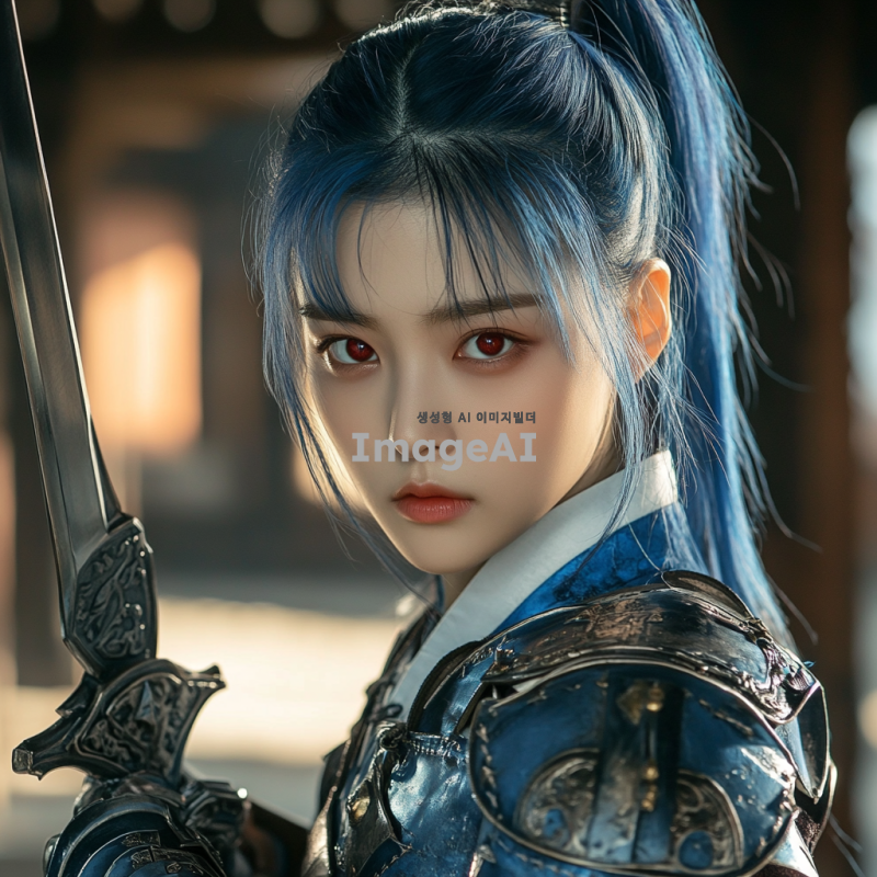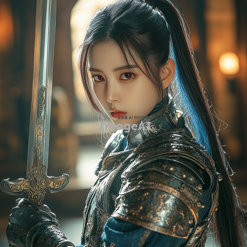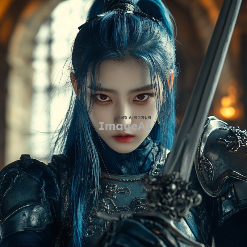 하늘색 머리를 한 갈래로 묶은 한국인 젊은 여성, 붉은 눈, 중세 스타일의 기사복을 입고 있으며, 강력한 검을 두 손으로 들고 정면을 응시하는 모습, 배경은 중세 성의 내부, 차분하고 결연한 표정.