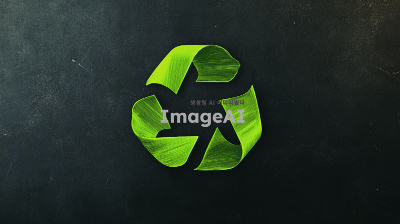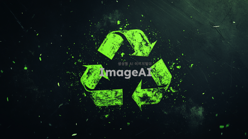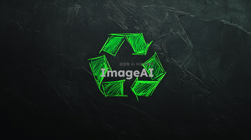 검은색 배경 위에 밝은 초록색으로 그려진 재활용 로고, 로고는 중앙에 위치하고 선명하게 보이며, 깨끗하고 현대적인 스타일로 디자인된 모습.