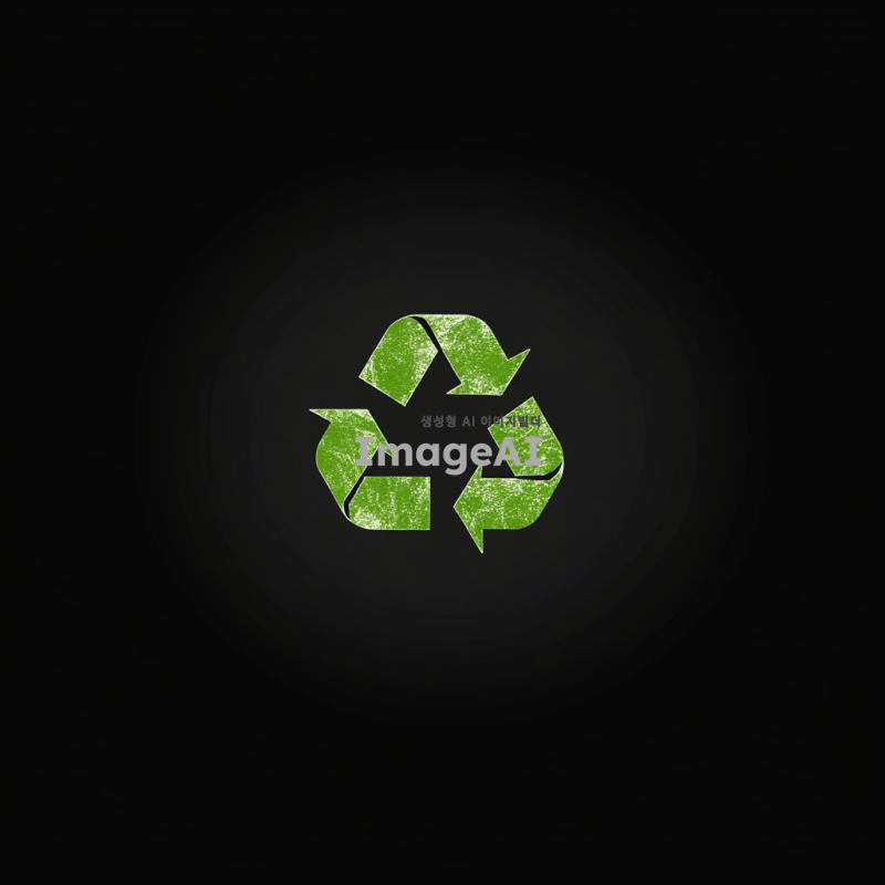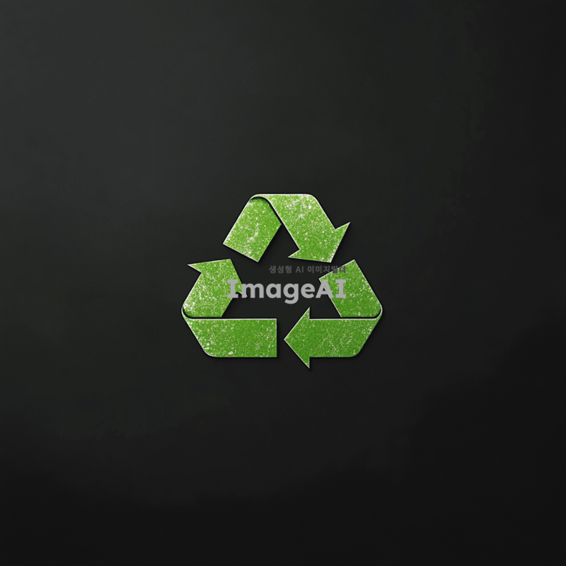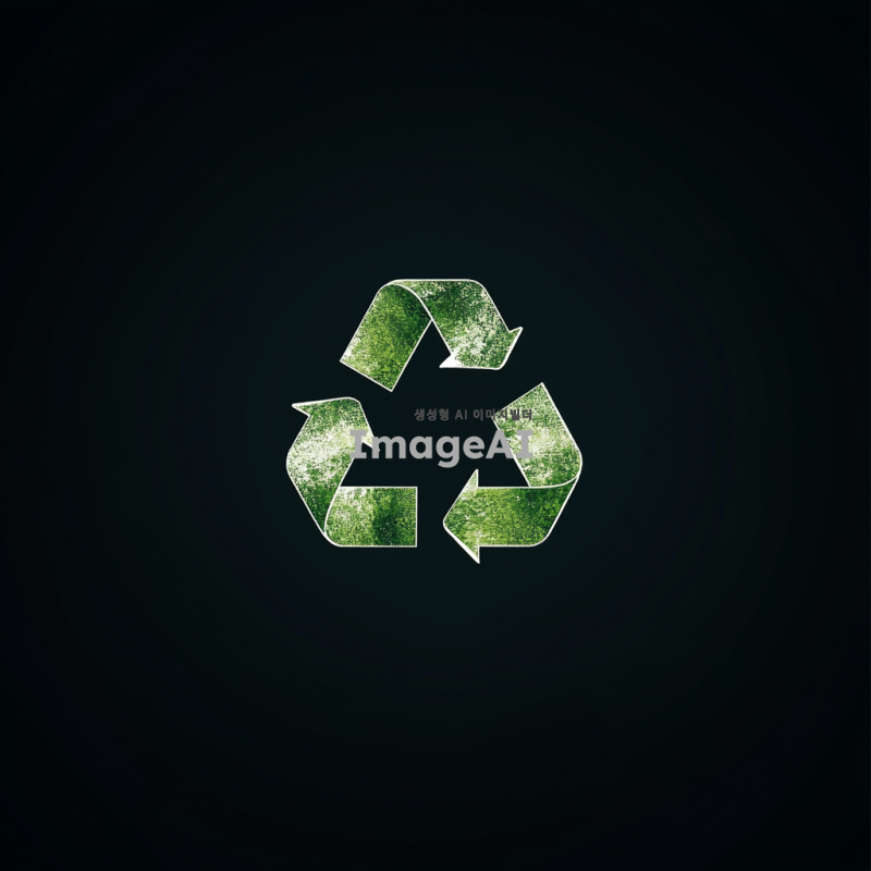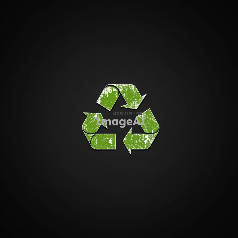 검은색 배경에 초록색 재활용 로고가 중앙에 위치한 이미지, 로고는 선명하고 깔끔한 디자인, 배경은 단순하고 로고가 돋보이도록 구성, 조명 효과는 최소화하여 로고가 강조되도록 연출.