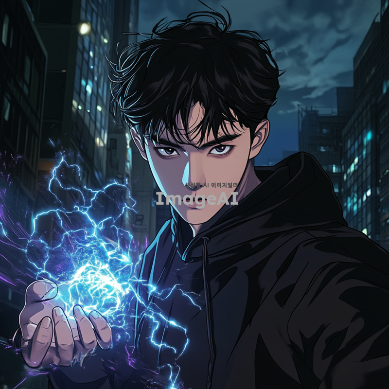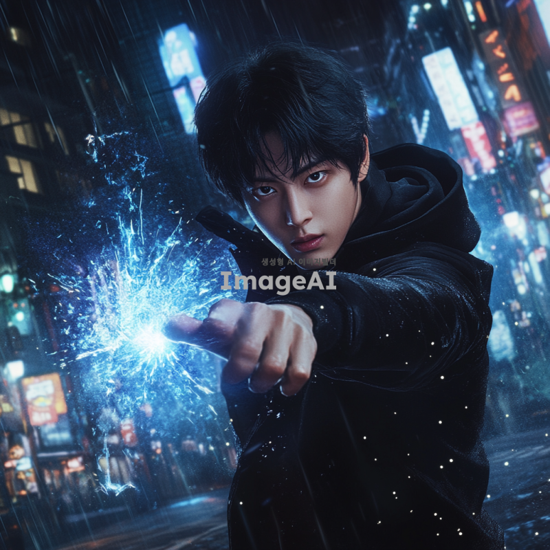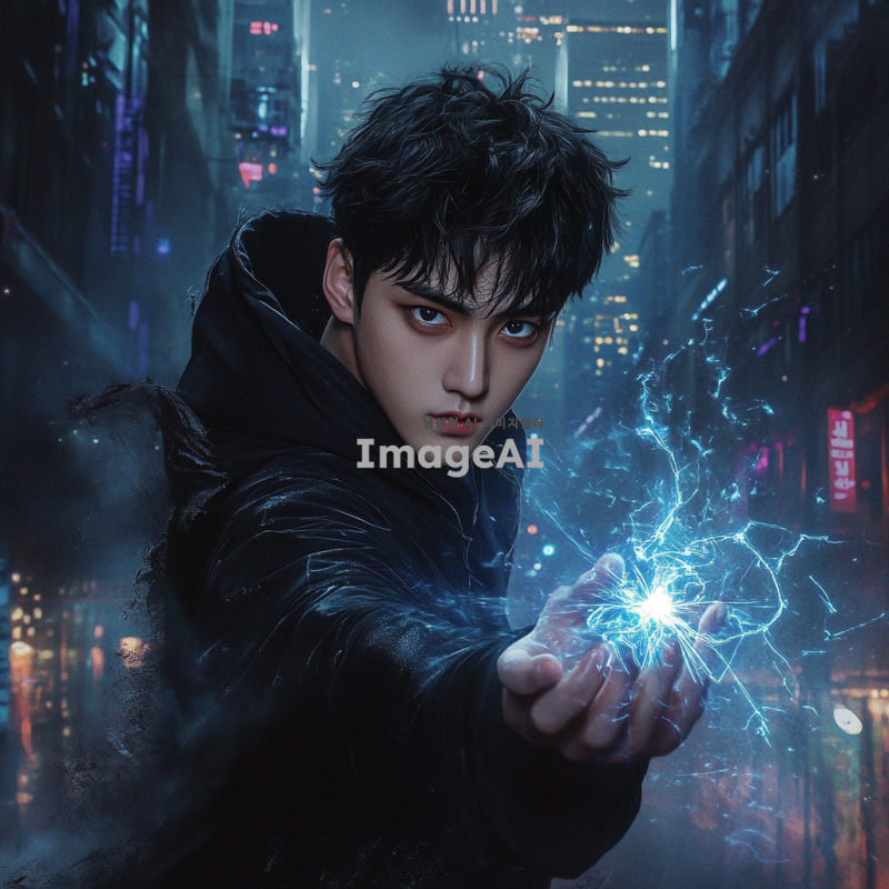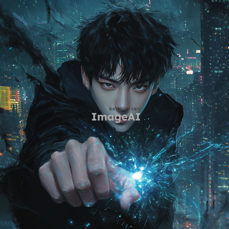 검은 머리를 가진 젊은 한국 남성, 날카로운 눈매와 강렬한 표정을 가진 얼굴, 검은색 후드티를 입고 있으며, 주위에 어둠의 그림자가 드리워져 있다. 손에는 파란빛이 나는 마법의 에너지가 모여 있으며, 배경은 도시의 밤 풍경으로, 빌딩 불빛이 희미하게 비치고 있다. 강력한 존재감을 느낄 수 있는 역동적인 포즈.