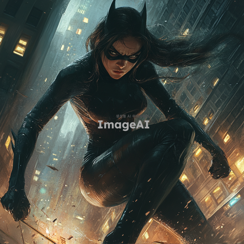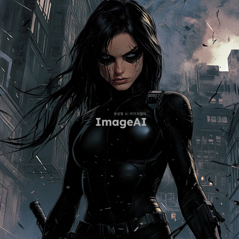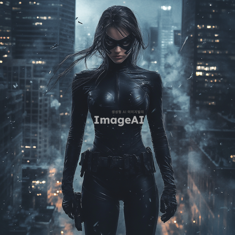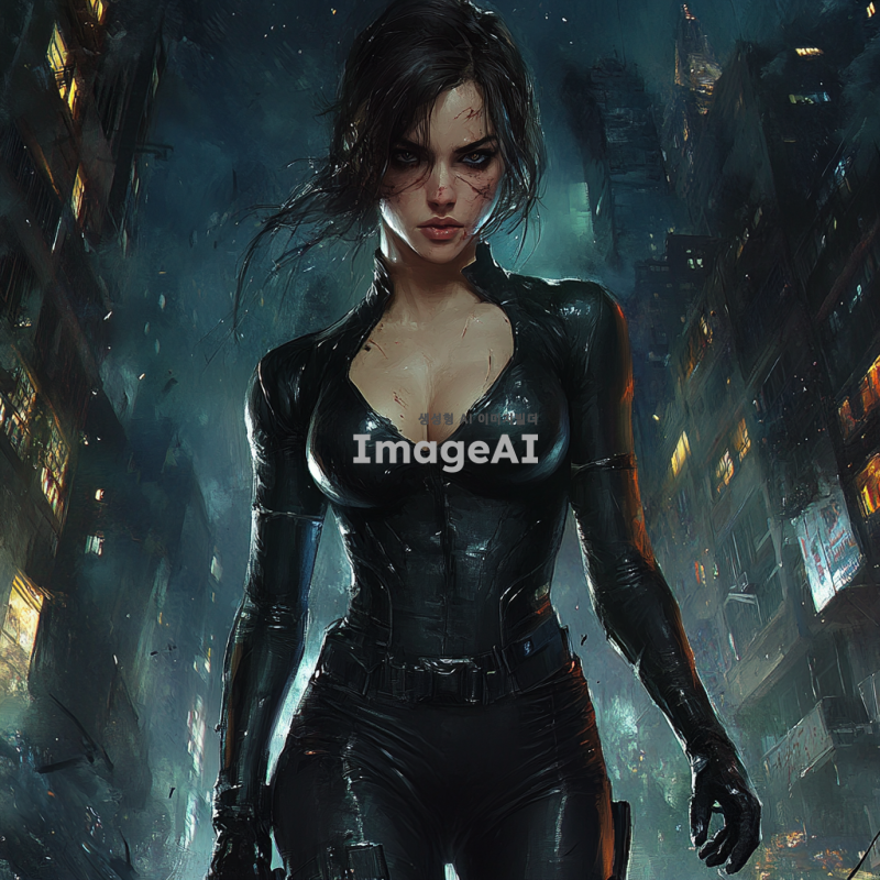 어두운 도시 배경, 검은색 타이트한 슈트를 입고 있는 여성 히어로, 슈트는 약간 찢어져 있으며, 심한 부상을 입고 지친 모습으로 쓰러져 있음, 얼굴에 마스크는 없음, 주변에 약간의 파손된 건물과 연기, 긴장감 있는 분위기.