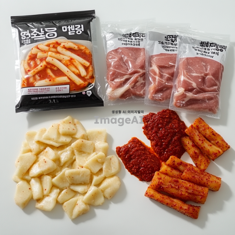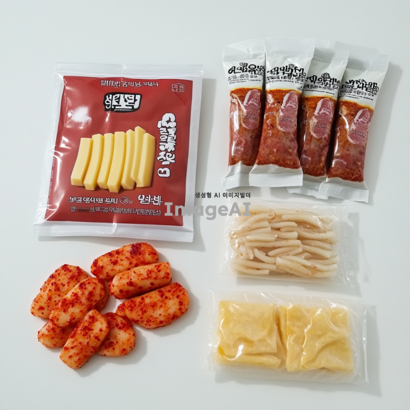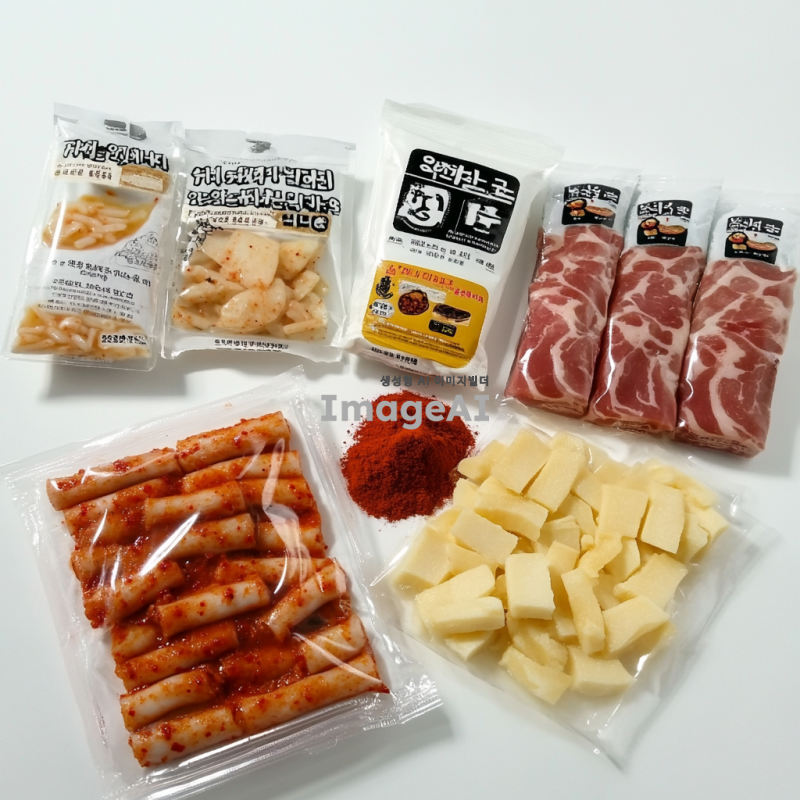 흰색 배경에 떡볶이 밀키트 포장지가 있다. 옆에 포장된 떡볶이 떡, 포장된 치즈, 포장된 빨간 가루, 포장된 베이컨, 포장된 어묵이 나열되어 있다.