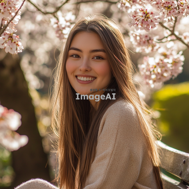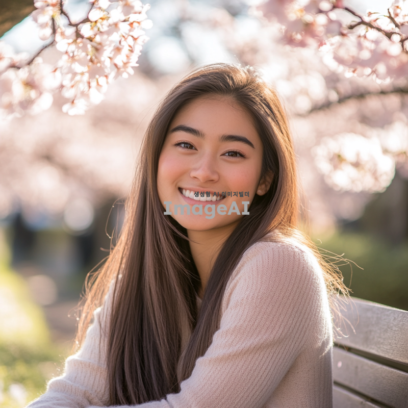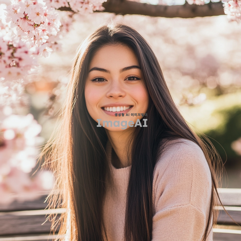 20대 한국인 여성, 긴 생머리, 밝은 미소, 화사한 봄날의 공원에서 벤치에 앉아 있는 모습, 주변에는 벚꽃이 만개해 있으며, 따뜻한 햇살이 그녀의 얼굴을 부드럽게 비추고 있는 장면, 캐주얼한 옷차림, 자연스러운 포즈, 생동감 있는 색감.