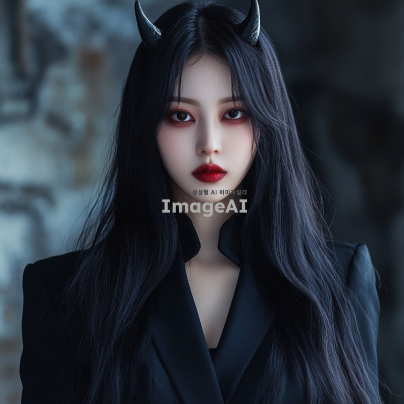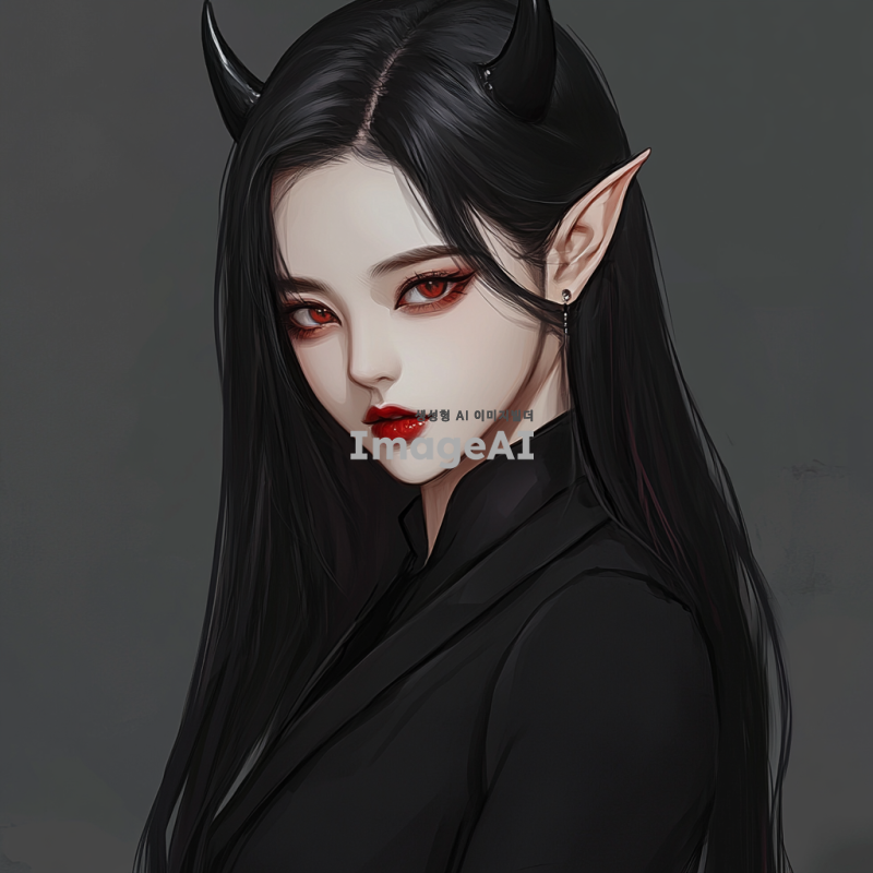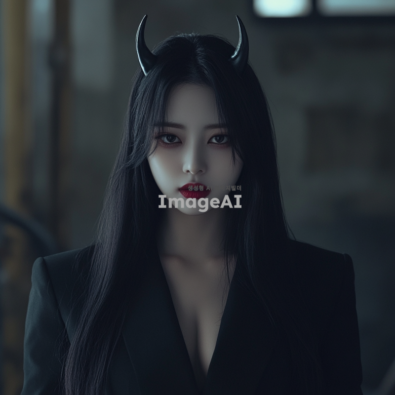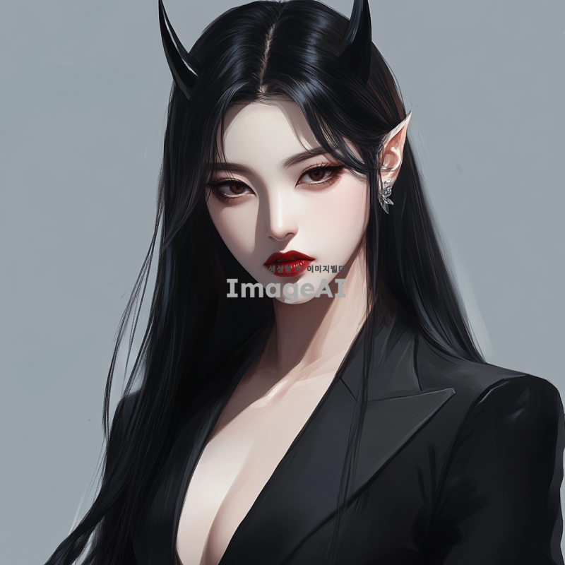검은 장발을 가진 한국인 여성, 하얀 피부와 매서운 눈매, 도톰하고 빨간 입술을 강조. 검은 슈트를 입고 있으며, 머리 위에 작은 악마뿔이 나있음. 차가운 인상을 주며, 비열한 웃음을 짓고 있는 모습.