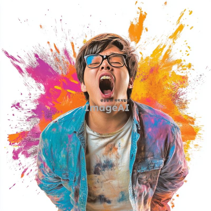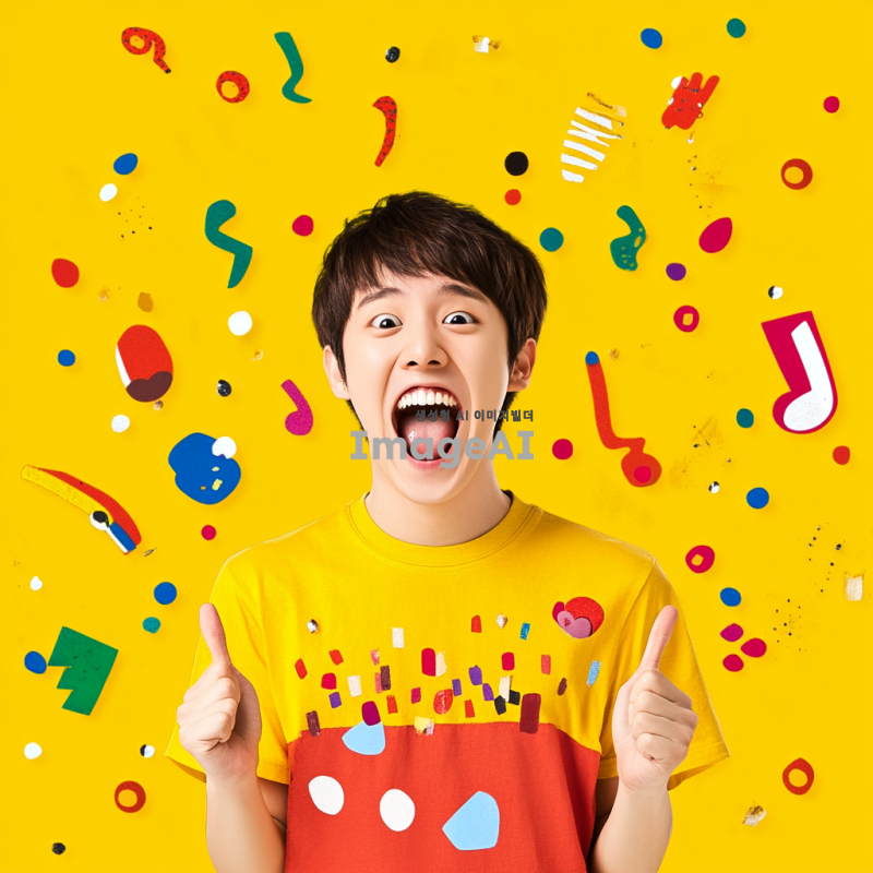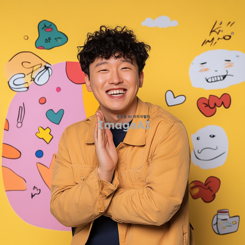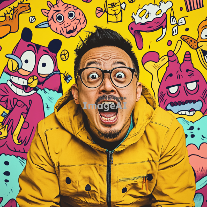 밝고 유쾌한 분위기의 스케치 코미디 유튜브 채널 프로필 이미지. 한국인을 주인공으로 하여 웃음을 유발하는 표정을 짓고 있는 모습. 다양한 코미디 요소가 포함된 배경, 예를 들어 웃음을 연상시키는 만화적인 요소들이 가득한 장면. 채널의 특성을 잘 나타낼 수 있도록 생동감 넘치는 색상과 재미있는 디테일을 강조.