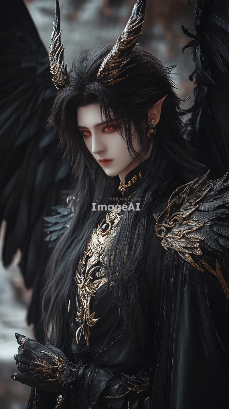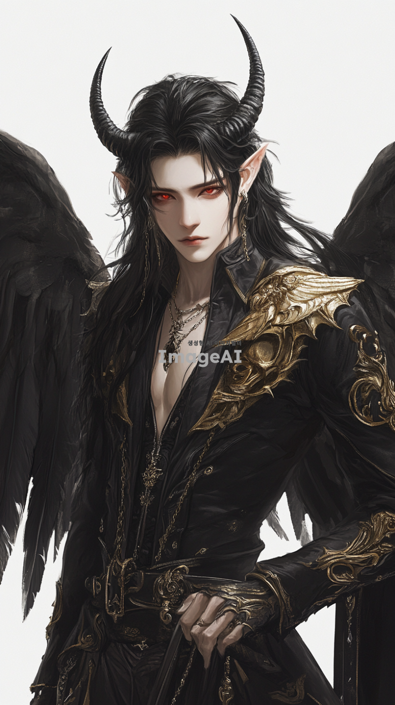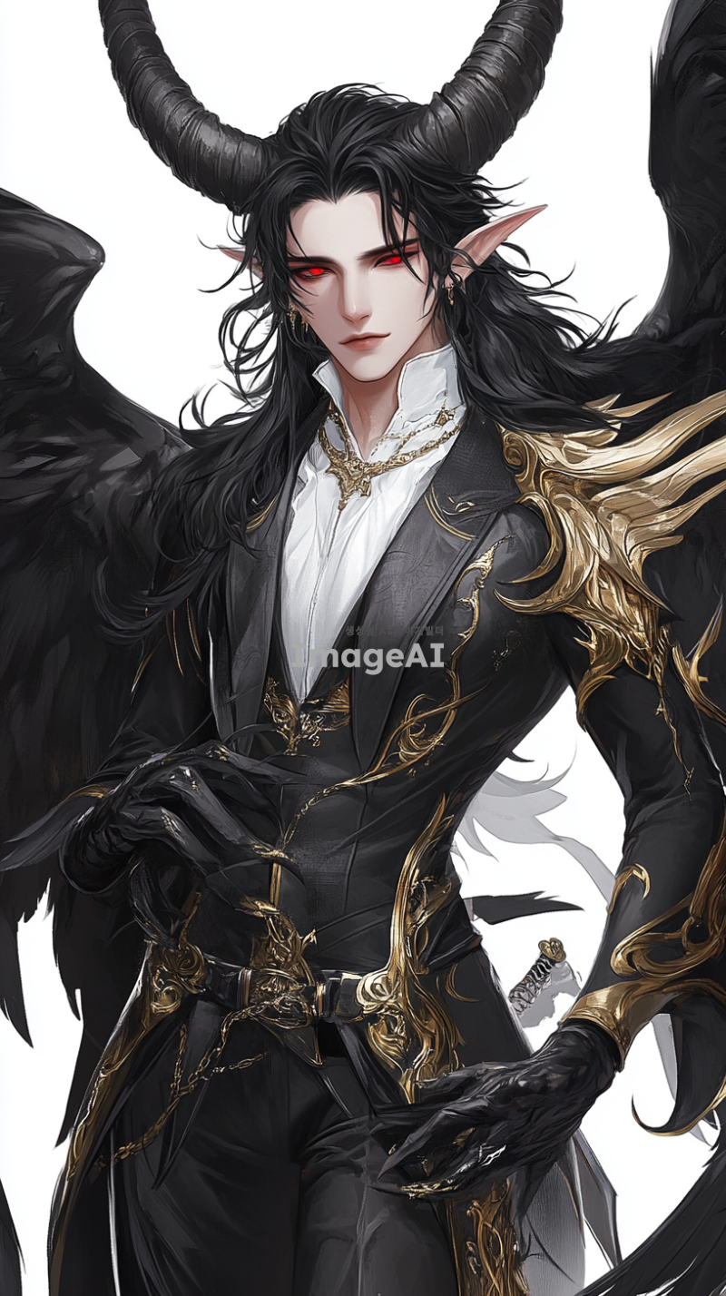20살 남성, 키 187cm, 검은 웨이브 장발, 매섭고 또렷한 이목구비, 창백하고 하얀 피부, 붉은 눈동자, 도도한 성격. 검은색과 금색이 어우러진 승마복을 입고 있으며, 깃털이 풍부한 검은 날개와 크고 화려한 뿔을 가진 모습.