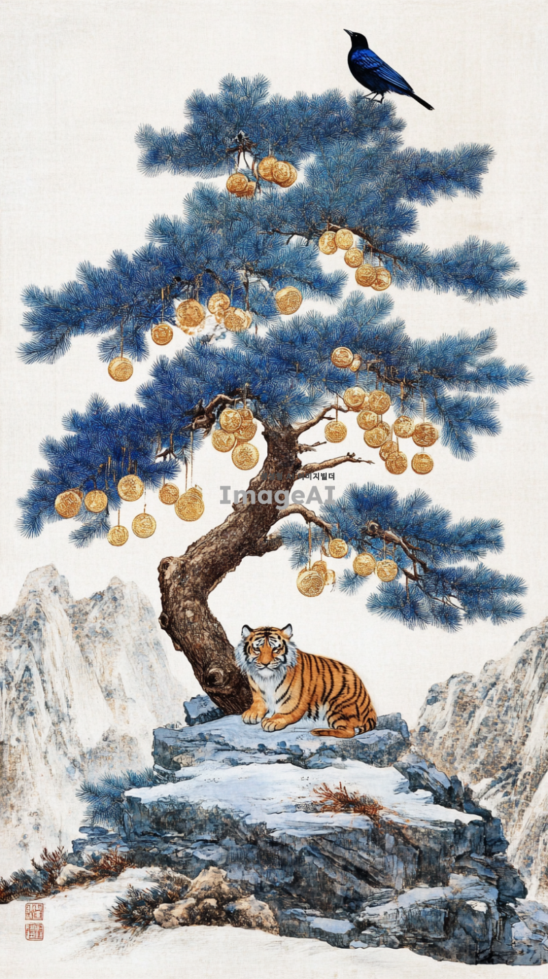 푸른 소나무 전체가 보이는 풍경, 소나무 밑에는 큰 호랑이가 그림 밖을 응시하고 있음. 소나무 가지에는 금화가 주렁주렁 열려있고, 소나무 위에는 까치가 앉아있는 장면.