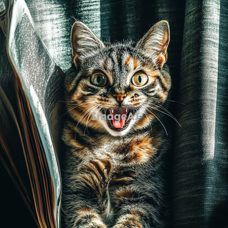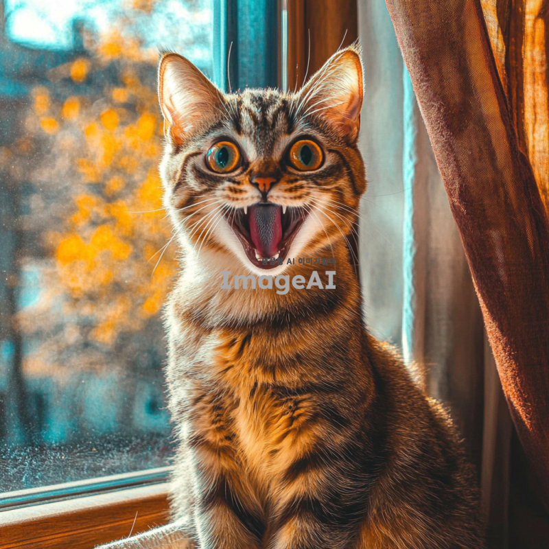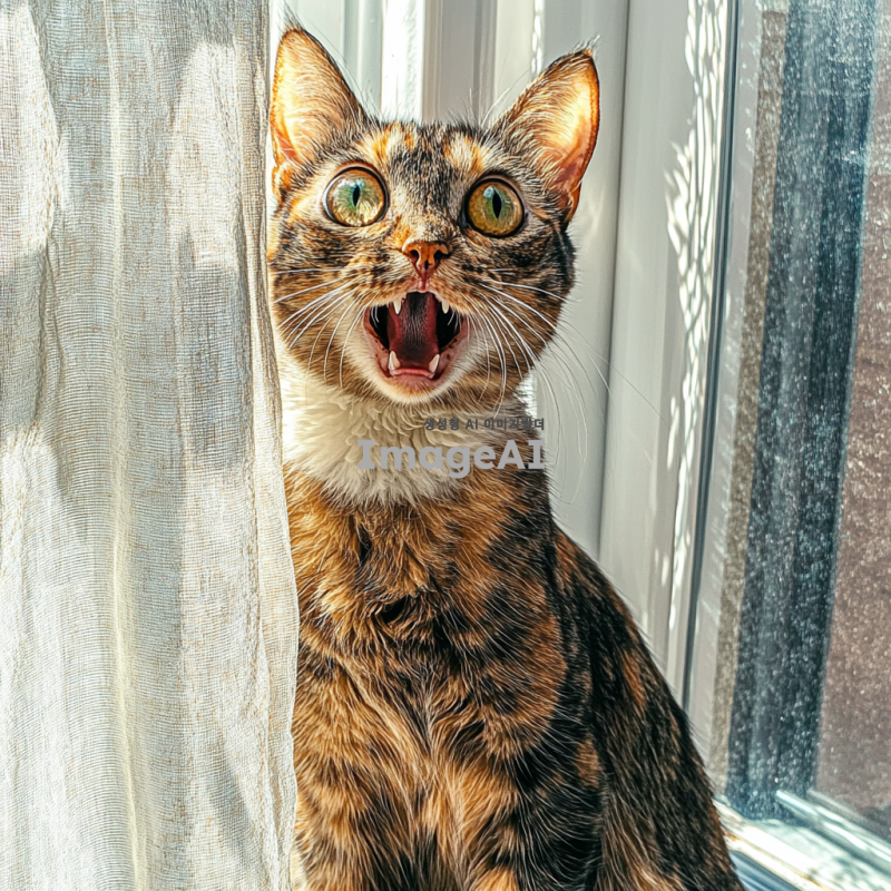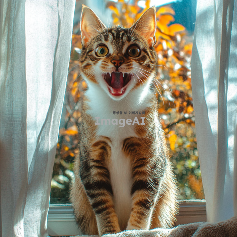 귀여운 고양이가 카메라를 향해 앉아 있으며, 입을 살짝 벌리고 야옹하는 모습, 큰 눈망울과 부드러운 털이 돋보이며, 사랑스러운 표정으로 시선을 사로잡는다, 따뜻한 햇살이 고양이의 털에 부드럽게 비춰 더욱 포근한 느낌을 준다, 배경은 아늑한 실내 공간으로 고양이의 귀여움을 강조한다.