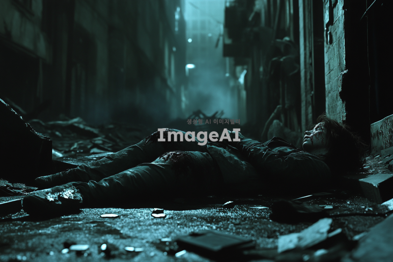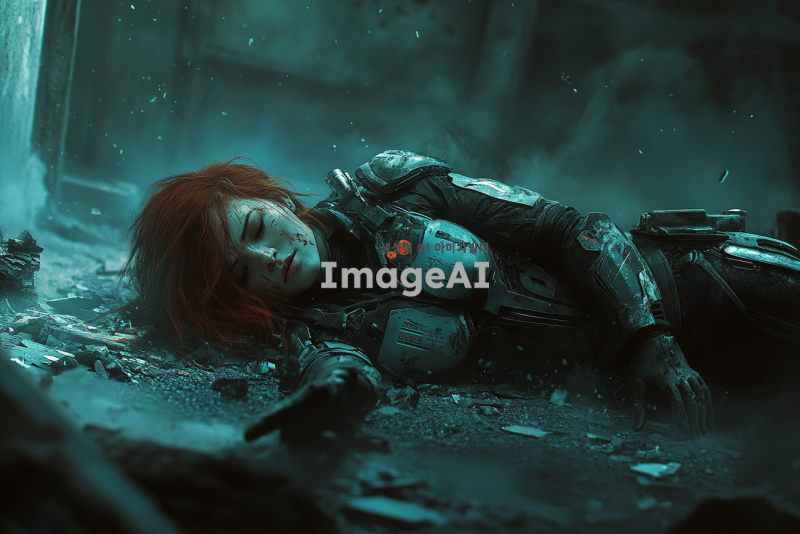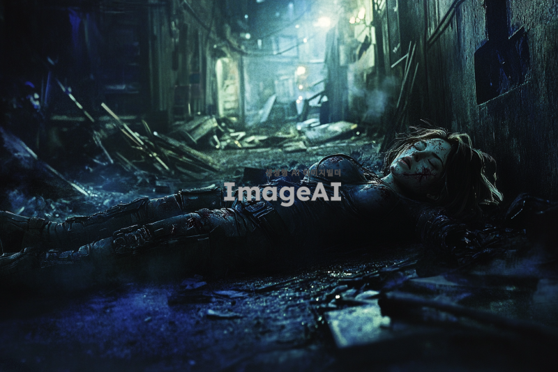 도시의 어두운 골목길에 쓰러져 있는 여자 히어로, 온몸에 부상을 입고 있으며, 그녀의 슈트는 찢어져 있고 여기저기 긁힌 자국이 있다. 주변에는 파편과 부서진 건물의 잔해가 흩어져 있고, 희미한 가로등 불빛이 그녀의 모습을 비추고 있다. 히어로의 얼굴에는 결의와 피로가 함께 묻어 있으며, 그녀의 손에는 아직도 강한 의지가 느껴진다. 배경은 도시의 밤, 긴장감이 감도는 분위기.