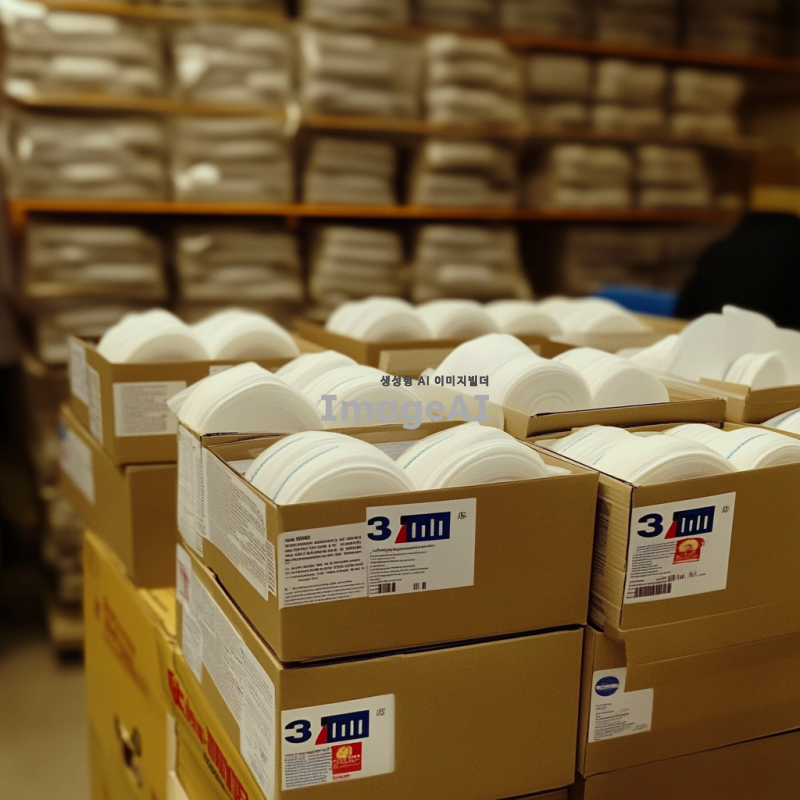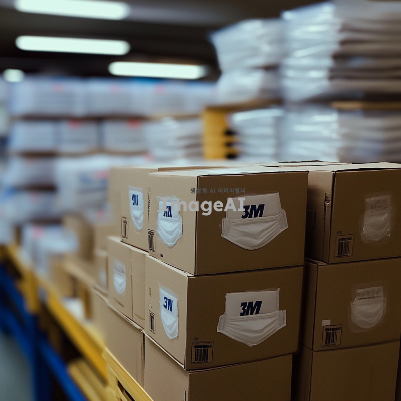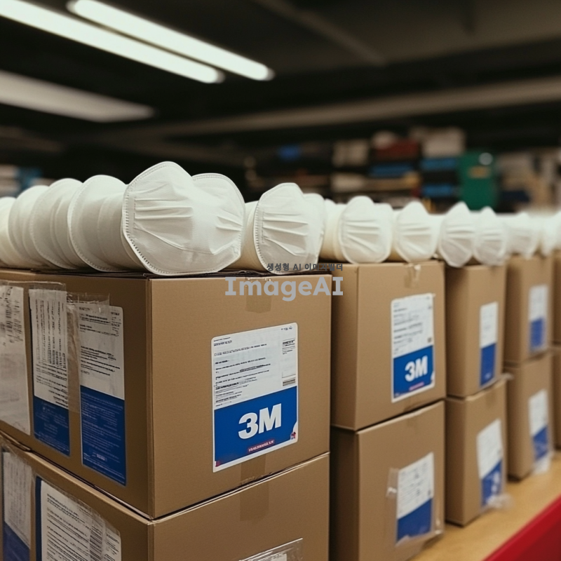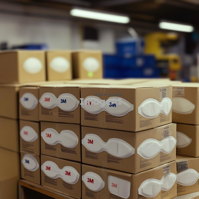 3M 마스크가 여러 상자에 깔끔하게 쌓여 있는 모습, 조명이 부드럽게 비추는 실내 공간, 마스크 상자에 3M 로고가 선명하게 보이는 장면,