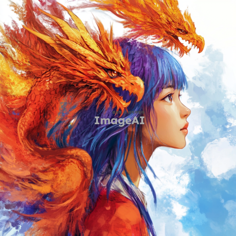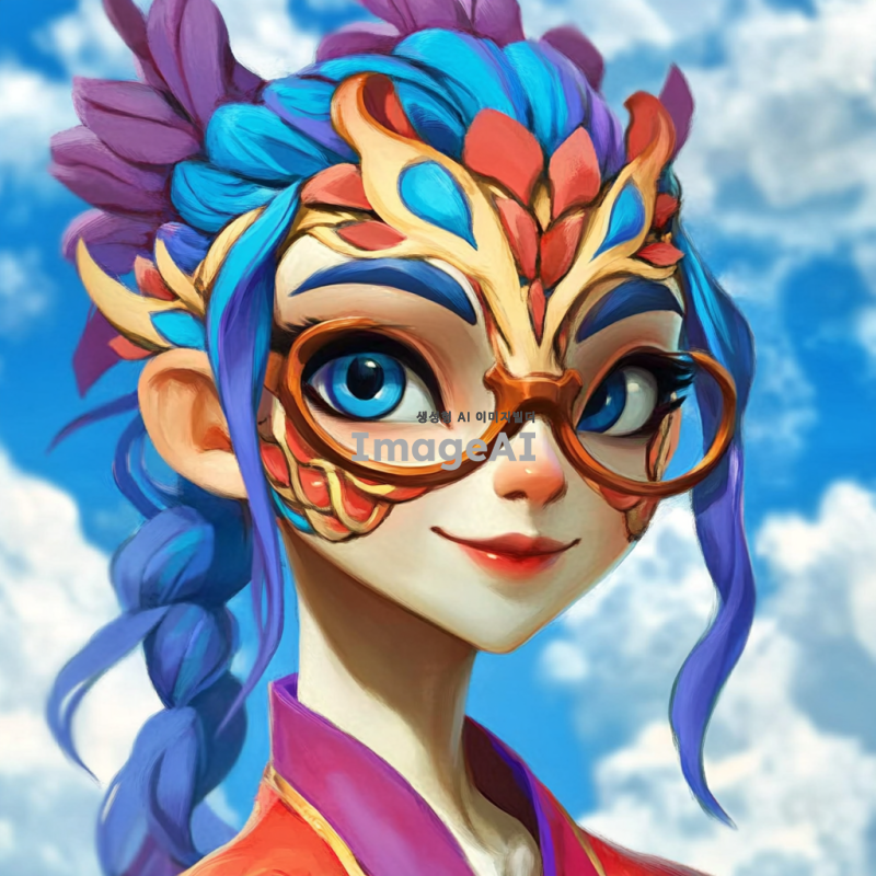 보라색과 파란색이 섞인 머리를 가진 한국인 애니메이션 캐릭터, 용의 가면을 쓰고 있는 모습, 환상적이고 신비로운 분위기, 밝고 선명한 색감, 애니메이션 스타일, 세부적인 드래곤 스케일과 화려한 장식이 있는 가면, 배경은 몽환적인 하늘과 구름, 캐릭터의 표정은 자신감 있고 활기찬 느낌.