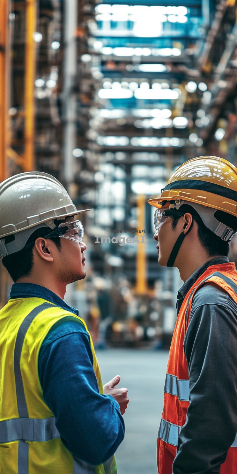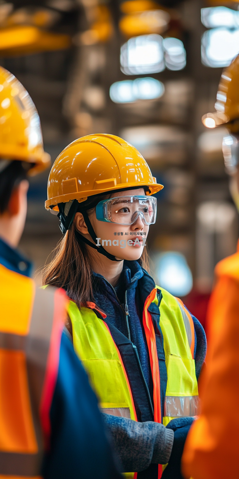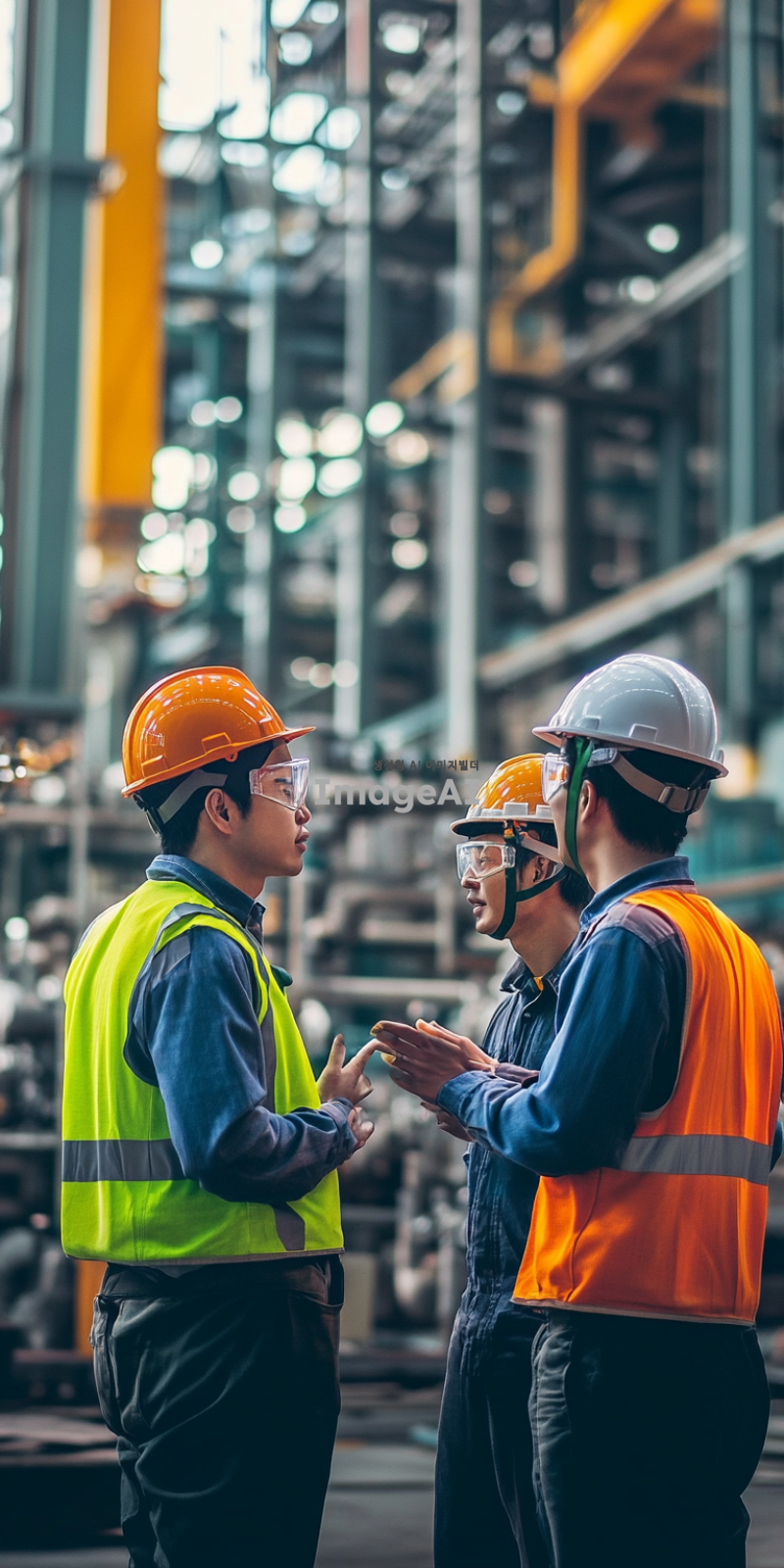 산업 현장에서 다양한 작업을 수행하는 한국인 근로자들이 안전 장비를 착용하고 협력하는 모습. 근로자들은 헬멧, 안전 고글, 반사 조끼 등을 착용하고 있으며, 서로의 안전을 확인하며 대화를 나누고 있다. 배경에는 안전 표지판과 안전 지침이 잘 보이는 작업장이 있으며, 작업장 내부는 깔끔하고 정돈된 모습이다. 햇빛이 밝게 비추는 날씨 속에서 근로자들의 얼굴에는 안전한 작업 환경에서 일하는 것에 대한 만족감과 자신감이 드러나 있다.