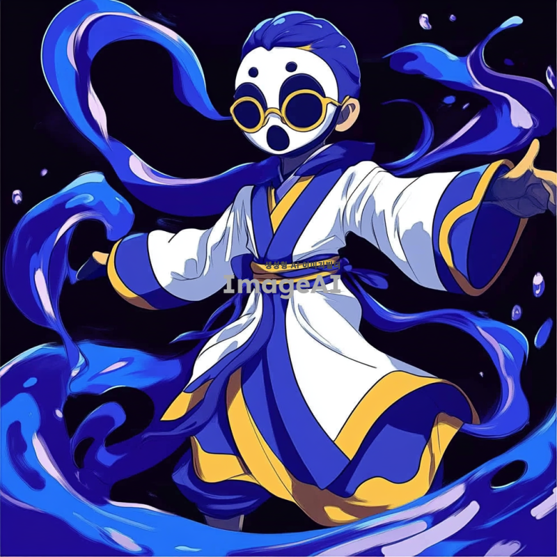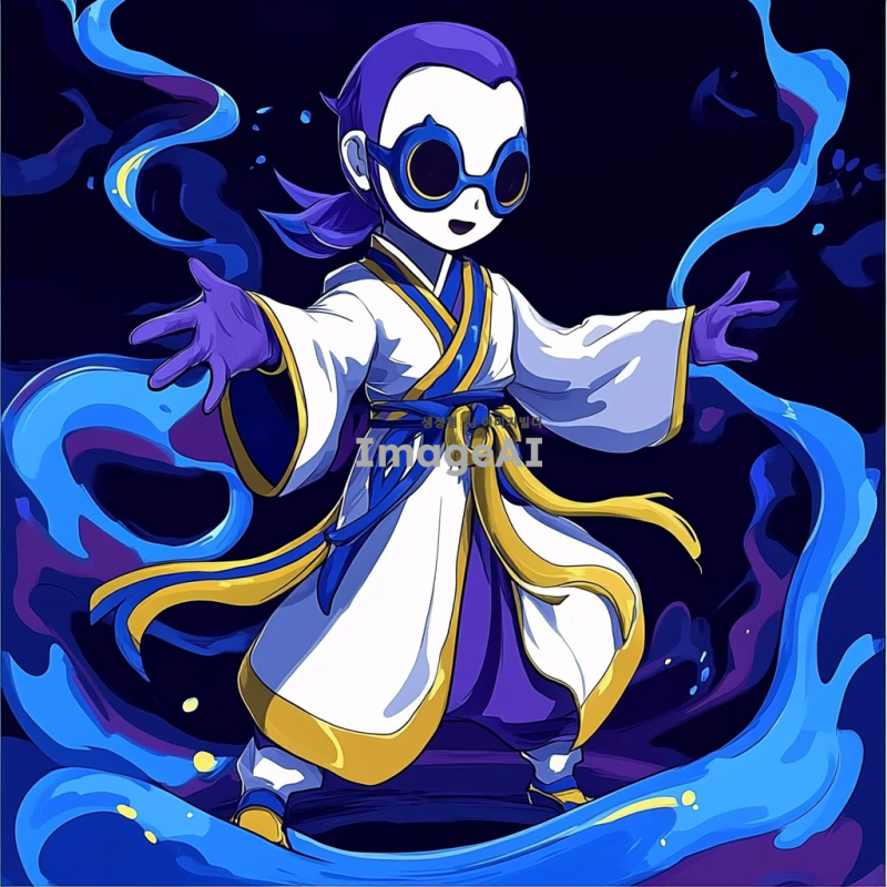 애니메이션 스타일의 한국인 남성 캐릭터, 보라색과 파란색이 섞인 머리카락, 멋진 용 모양의 가면을 착용, 하얀 피부, 역동적이고 카리스마 있는 포즈, 세련된 의상과 배경.