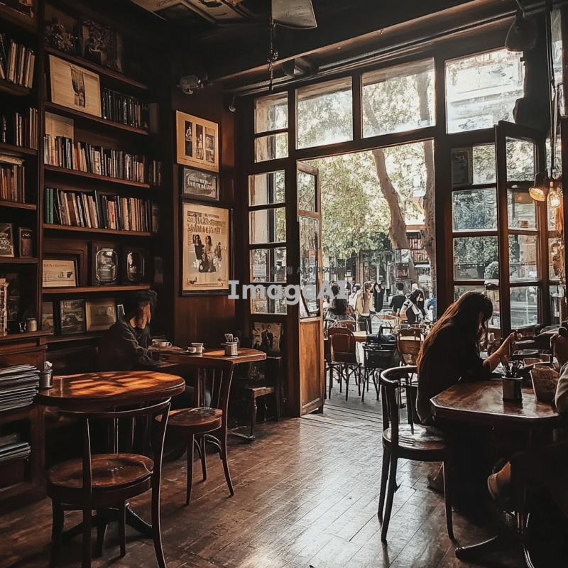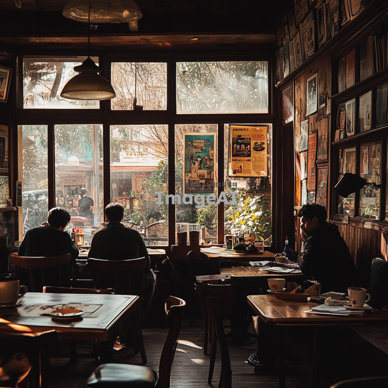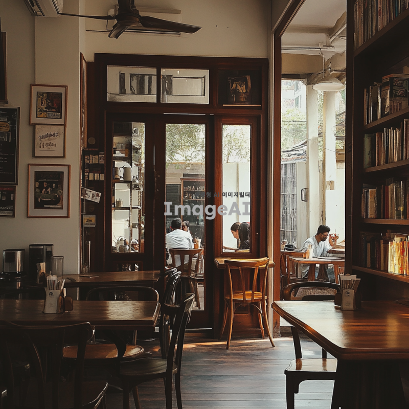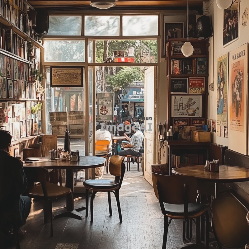 따뜻한 조명 아래 아늑한 엔틱 카페, 나무 테이블과 푹신한 의자가 놓인 공간, 벽에는 빈티지 포스터와 서적이 장식되어 있으며, 창문 너머로 부드러운 햇살이 들어오는 풍경, 커피 한 잔과 함께 여유롭게 휴식하는 사람들의 모습, 차분하고 편안한 분위기.