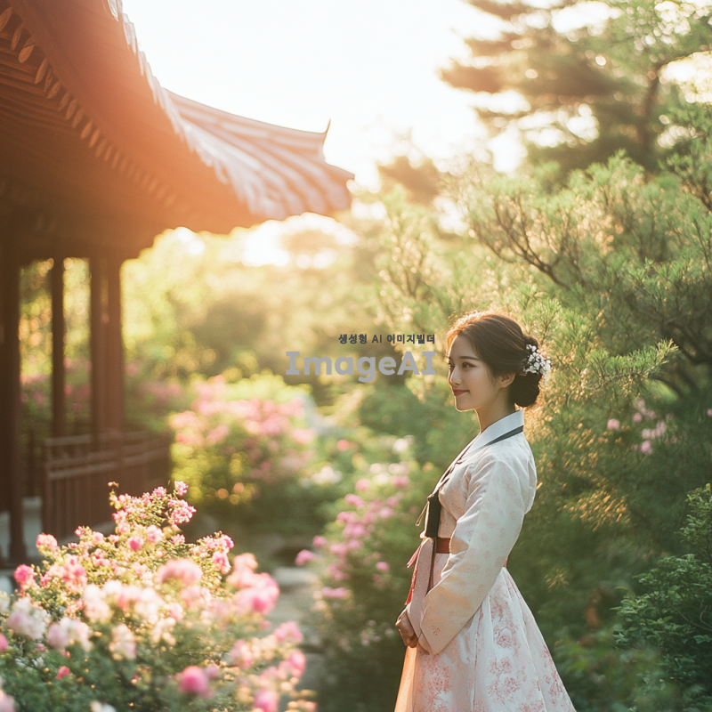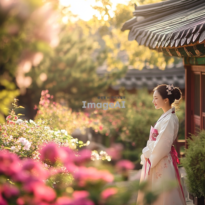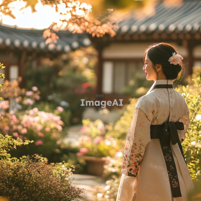 한국 전통 한복을 입은 여성이 전통 한국 정원을 배경으로 서 있는 모습. 정원에는 아름다운 꽃과 나무가 있으며, 평화롭고 조화로운 분위기를 자아냄. 여성은 부드러운 미소를 짓고 있으며, 자연과 조화롭게 어우러지는 모습. 따뜻한 햇살이 비추고 있으며, 전체적으로 밝고 생동감 있는 색감.
