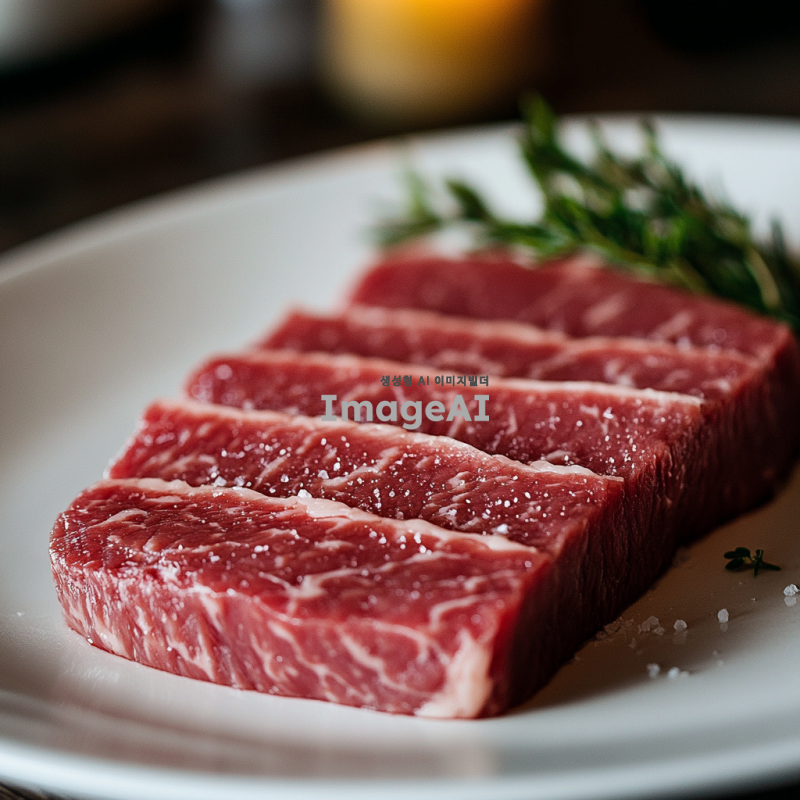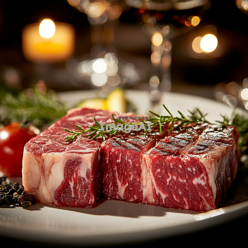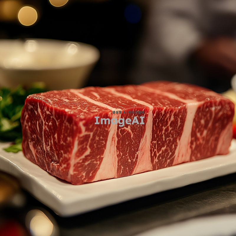 고급스러운 대리석 패턴이 돋보이는 최상급 소고기 스테이크, 선명한 붉은색과 흰색 지방이 조화를 이루며 고급 레스토랑의 정교한 조명 아래에서 빛나고 있는 모습, 육즙이 풍부하게 흐르는 질감과 섬세한 마블링 디테일이 강조된 클로즈업 샷, 고급스러운 식탁 위에 놓인 고급 소고기 요리.