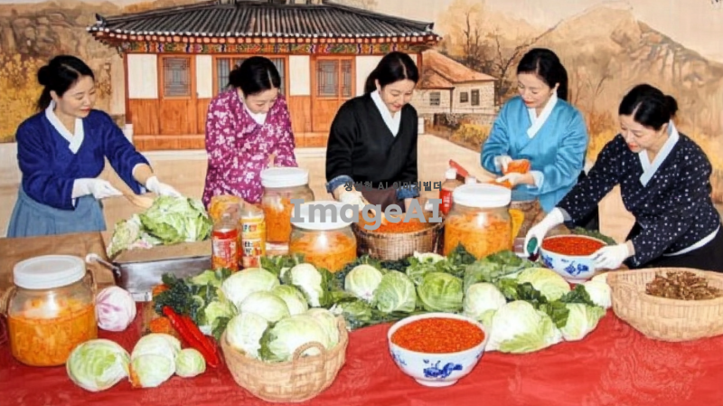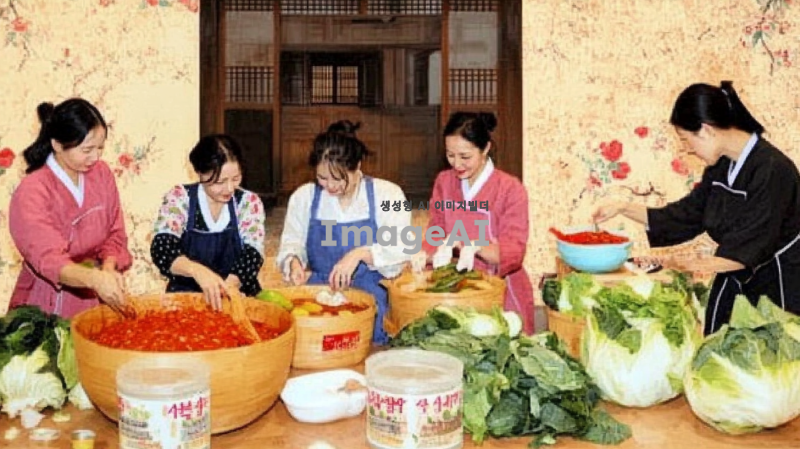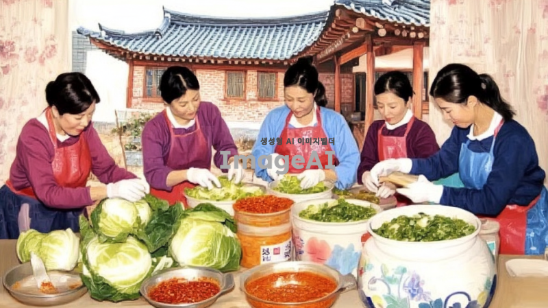 한국의 전통적인 김장하는 장면을 배경으로, 여러 명의 아줌마들이 함께 김치를 담그고 있는 모습을 그린다. 아줌마들은 밝고 활기찬 표정으로 서로 대화를 나누며 김장에 집중하고 있다. 주변에는 배추와 고춧가루, 양념 등이 준비되어 있으며, 김치가 담긴 큰 항아리들이 놓여 있다. 가을의 따뜻한 햇살이 비추는 가운데, 아줌마들은 전통적인 한복이나 편안한 작업복을 입고 있다. 배경에는 한국의 전통적인 농가가 보이며, 자연스럽고 따뜻한 색감으로 전체적인 분위기를 표현한다.