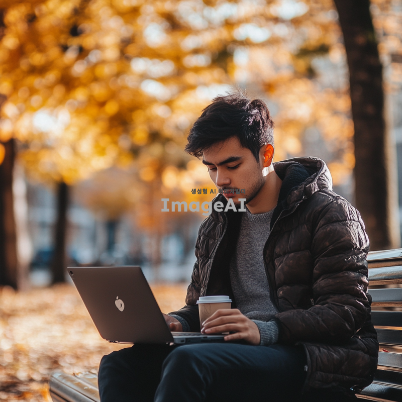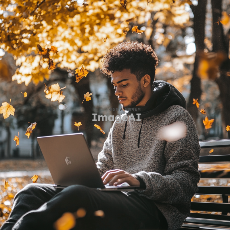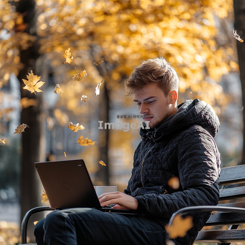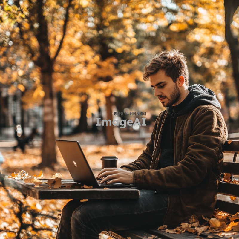 청년이 공원 벤치에 앉아 집중해서 노트북으로 코딩을 하고 있는 모습, 주변에는 가을의 낙엽이 흩날리고 있고, 청년의 얼굴에는 결의에 찬 표정이 담겨 있으며, 따뜻한 햇살이 비추는 오후의 분위기, 캐주얼한 옷차림과 노트북 옆에는 커피잔이 놓여 있는 장면.