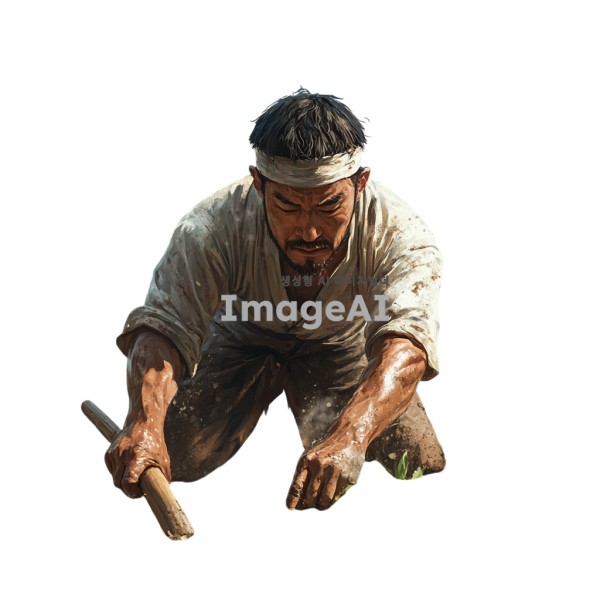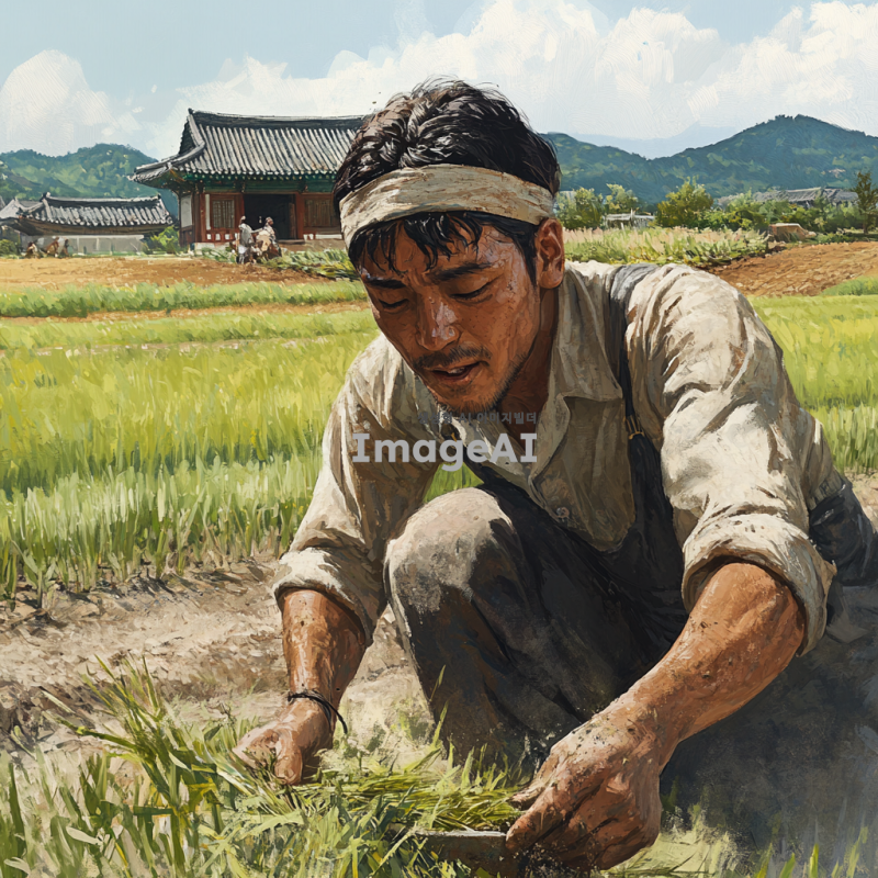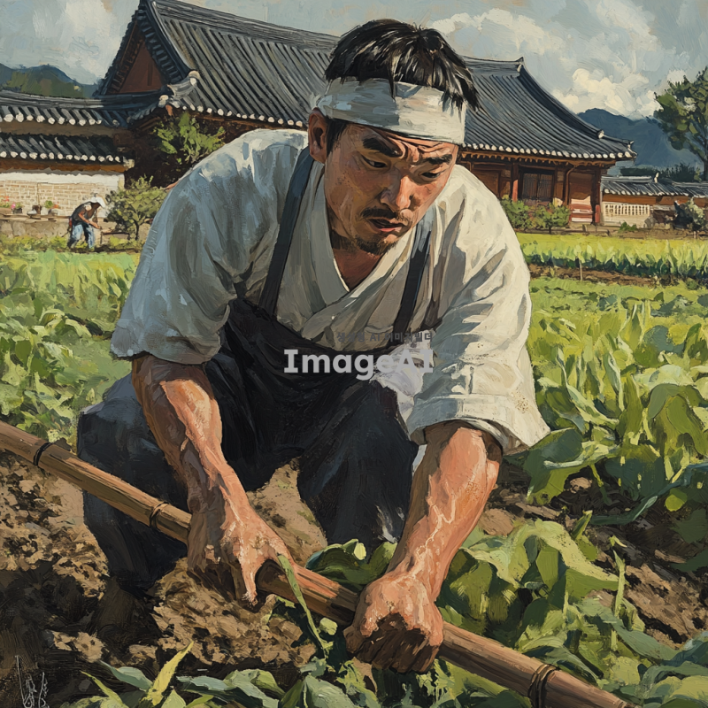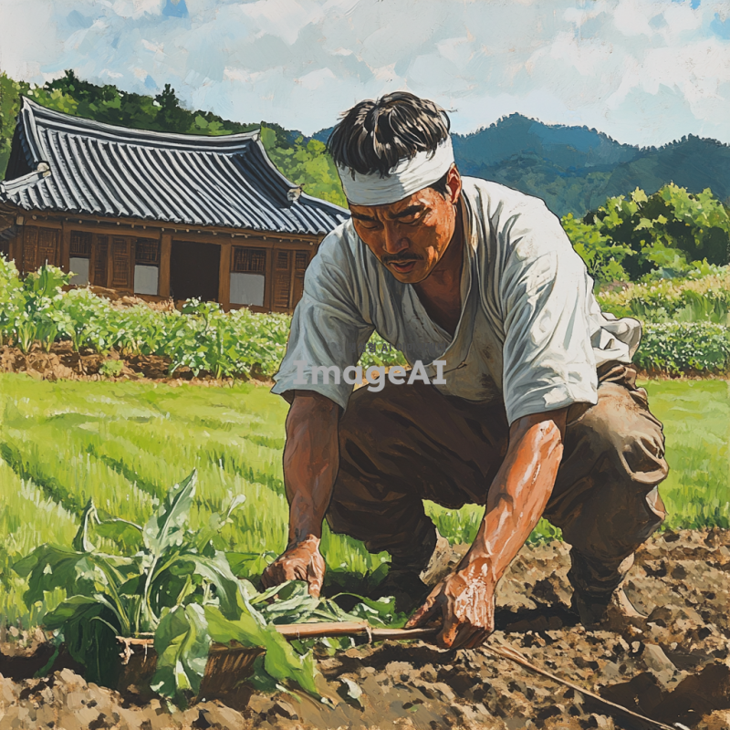 한국 전통 머리띠를 머리에 두르고 있는 머슴이 농장에서 열심히 일하는 모습, 밭에서 농기구를 사용하여 땅을 갈고 있는 장면, 주변에 푸른 논밭과 맑은 하늘, 전통 한옥이 배경으로 있는 풍경, 힘찬 자세와 땀방울이 맺힌 얼굴, 자연스러운 움직임과 생동감 넘치는 장면.