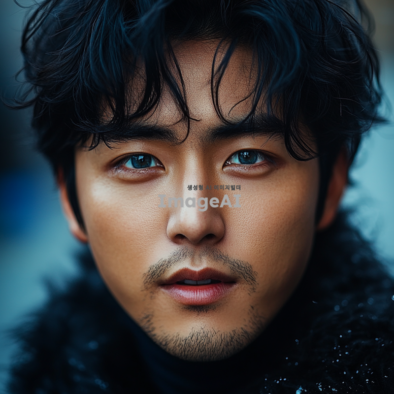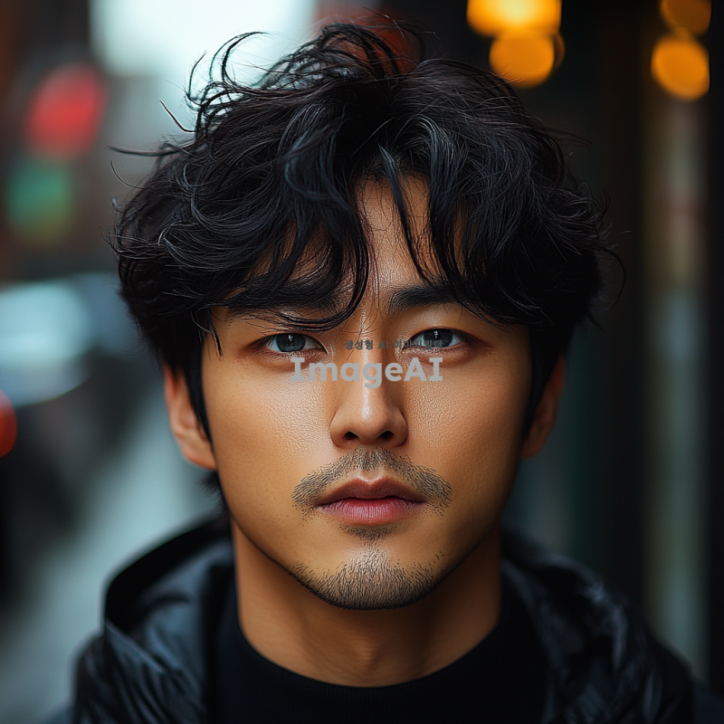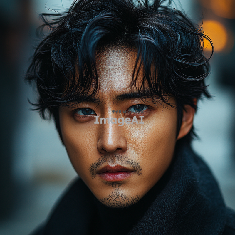 잘생긴 한국인 남성, 블랙 헤어, 푸른 눈, 살짝 째진 눈매, 약간의 양아치 느낌, 짝눈, 세련된 스타일, 도시 배경, 매력적이고 자신감 넘치는 표정.