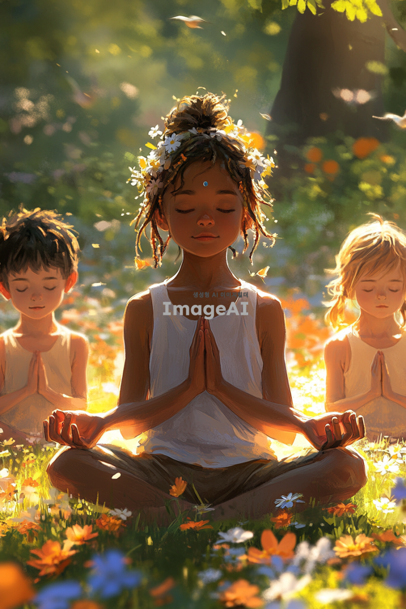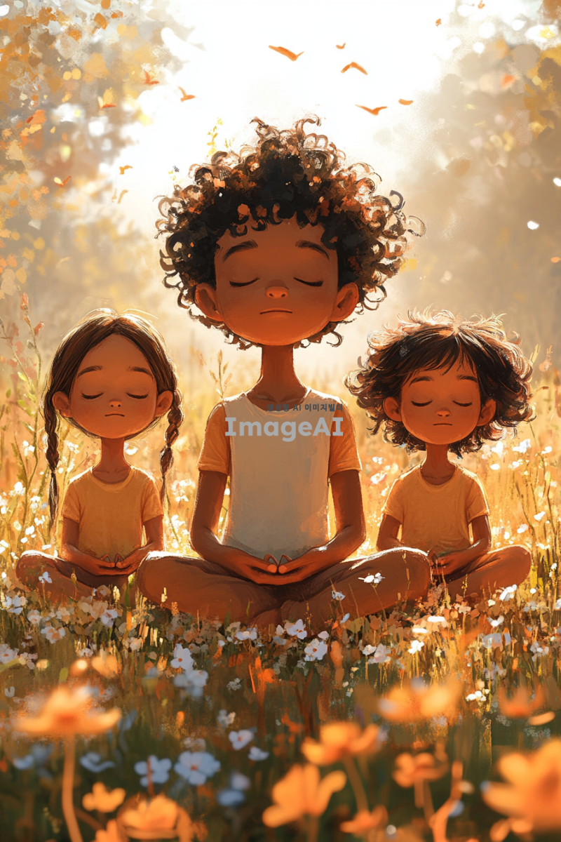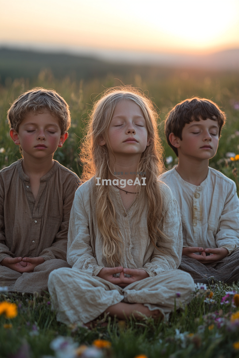 들판에 앉아 눈을 감고 명상하는 세 명의 아이들: 10살 남자아이, 8살 여자아이, 6살 남자아이. 아이들은 편안한 자세로 앉아 있으며, 주변에는 꽃과 풀이 가득한 들판이 펼쳐져 있다. 바람이 솔솔 불어와 아이들의 머리카락과 옷자락이 살짝 흔들리고, 햇살이 따뜻하게 내리쬐어 평화로운 분위기를 자아낸다. 멀리서 들리는 새소리가 배경을 채우며 자연의 아름다움을 더한다. 전체적인 색조는 따뜻하고 부드러운 느낌으로 표현되어 있다.
