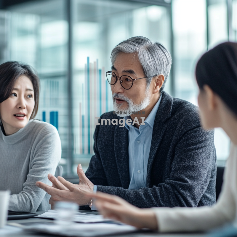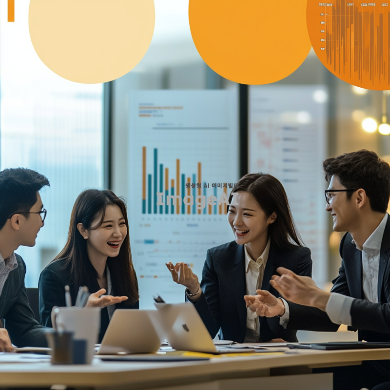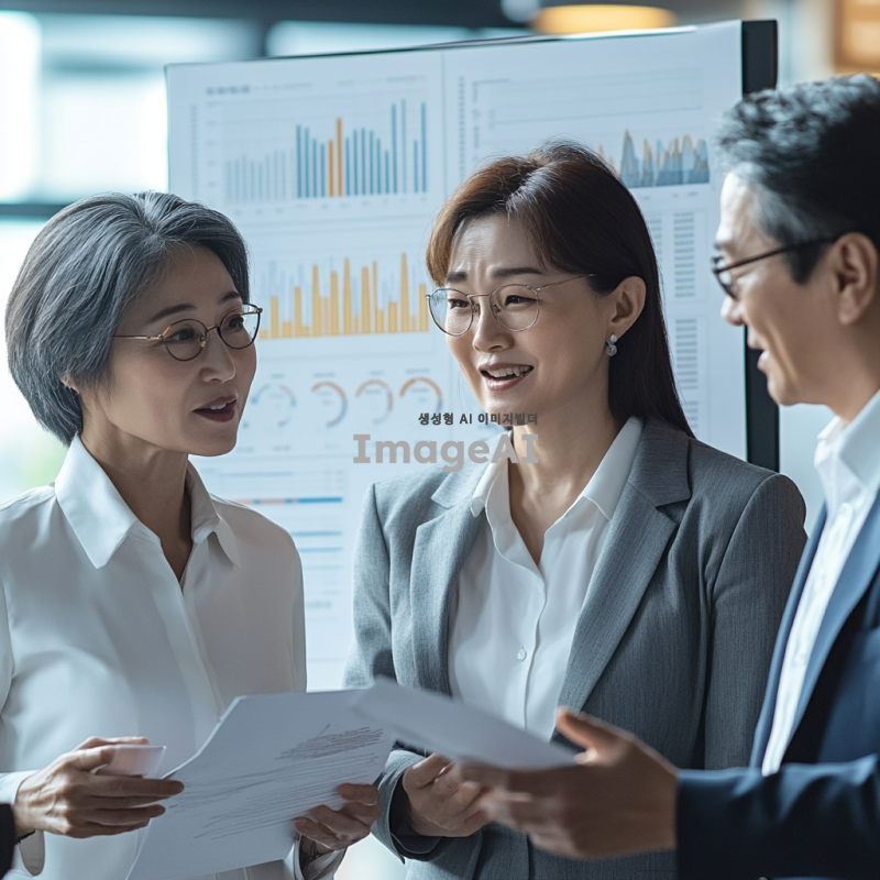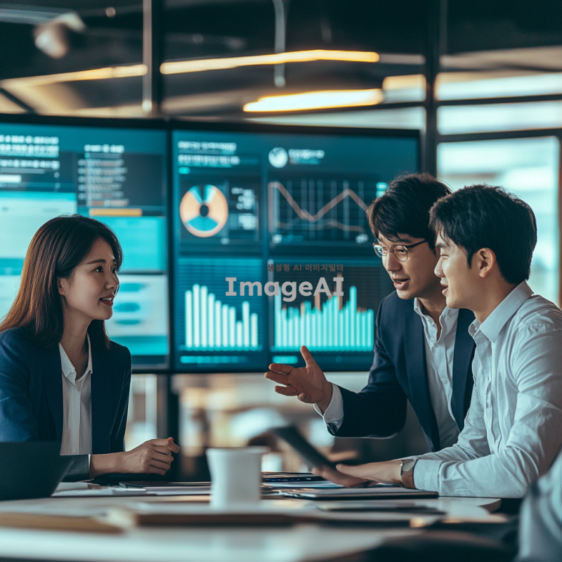 퇴직률 분석 및 제안에 관한 슬라이드에 맞는 이미지: 현대적인 사무실 환경에서 다양한 연령대의 한국인 직원들이 토론하는 모습, 각자의 의견을 나누며 협력하는 장면, 배경에는 그래프와 차트가 보이며, 긍정적이고 협력적인 분위기 강조.