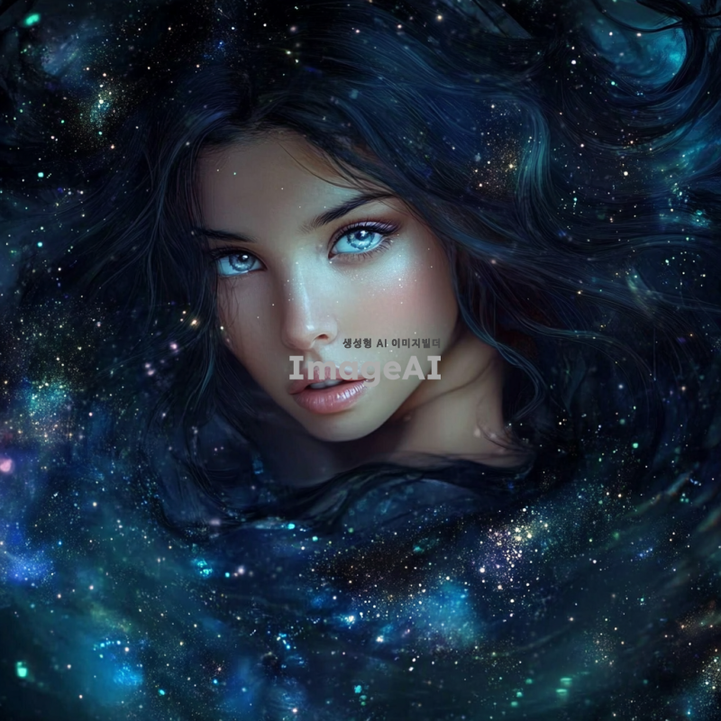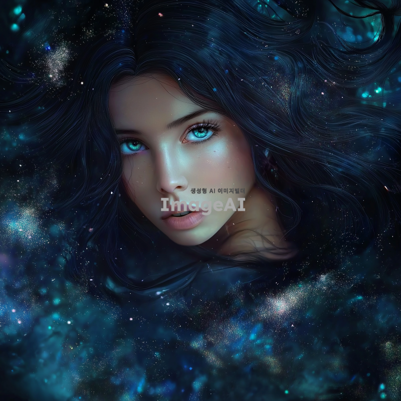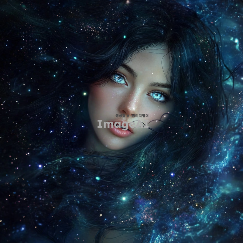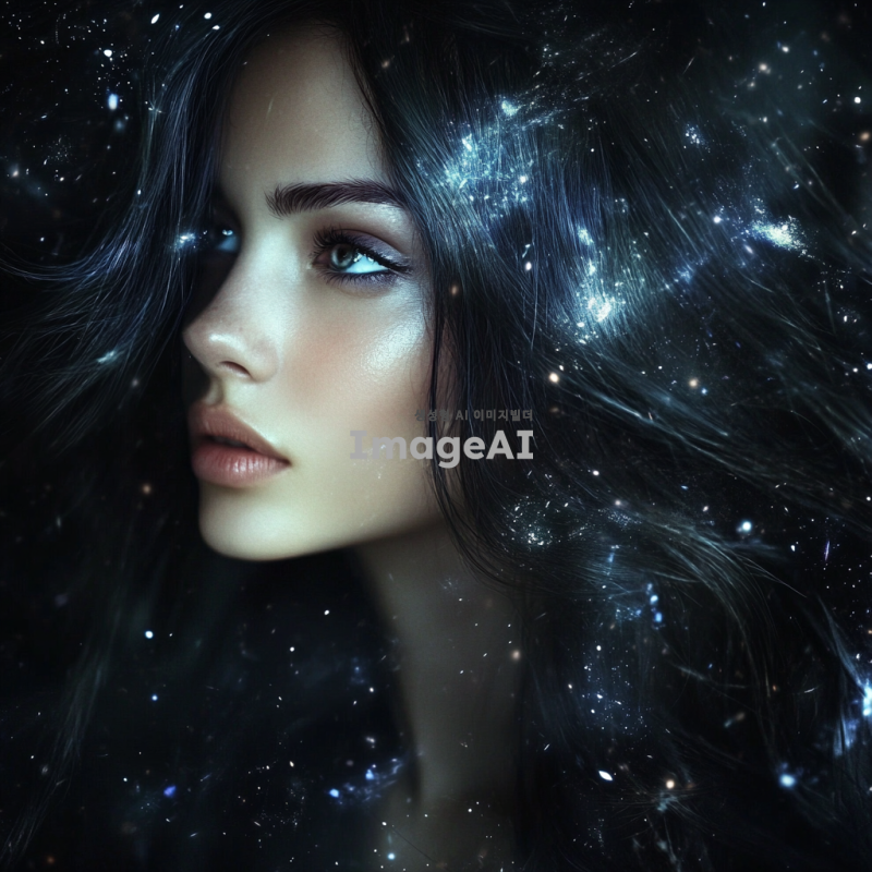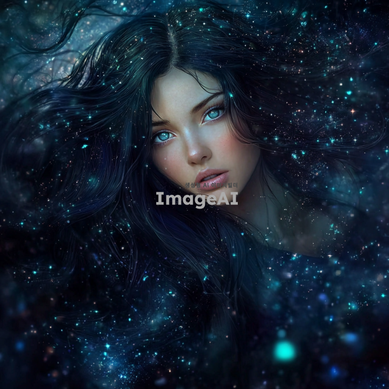 별빛이 쏟아지는 밤하늘처럼 검은 긴 생머리를 가진 아름다운 여성, 그녀의 눈동자는 프리즘을 연상시키는 빛나는 흰색이다. 그녀는 다정하고 상냥하며 어른스러운 성격을 지니고 있으며, 사연이 있지만 여전히 아이들과 인간을 믿고 사랑하는 모습을 보여준다. 그녀의 이름은 '아비'로, 무한이라는 의미를 내포하고 있다. 그녀의 모습은 평화롭고 따뜻한 분위기를 자아내며, 주변에는 별빛이 반짝이는 밤하늘의 풍경이 어우러져 있다.
