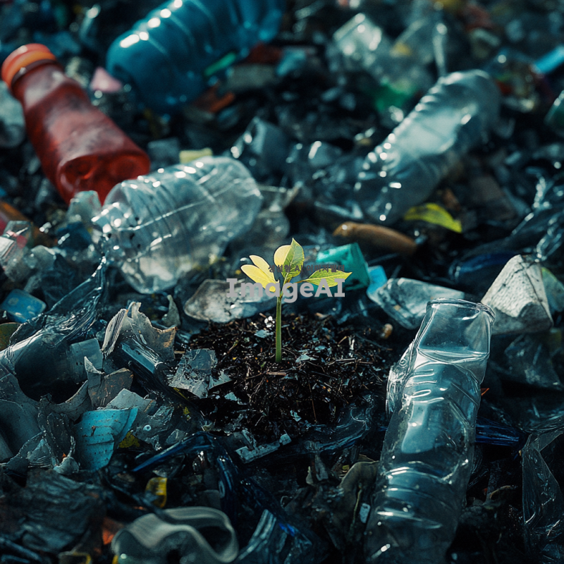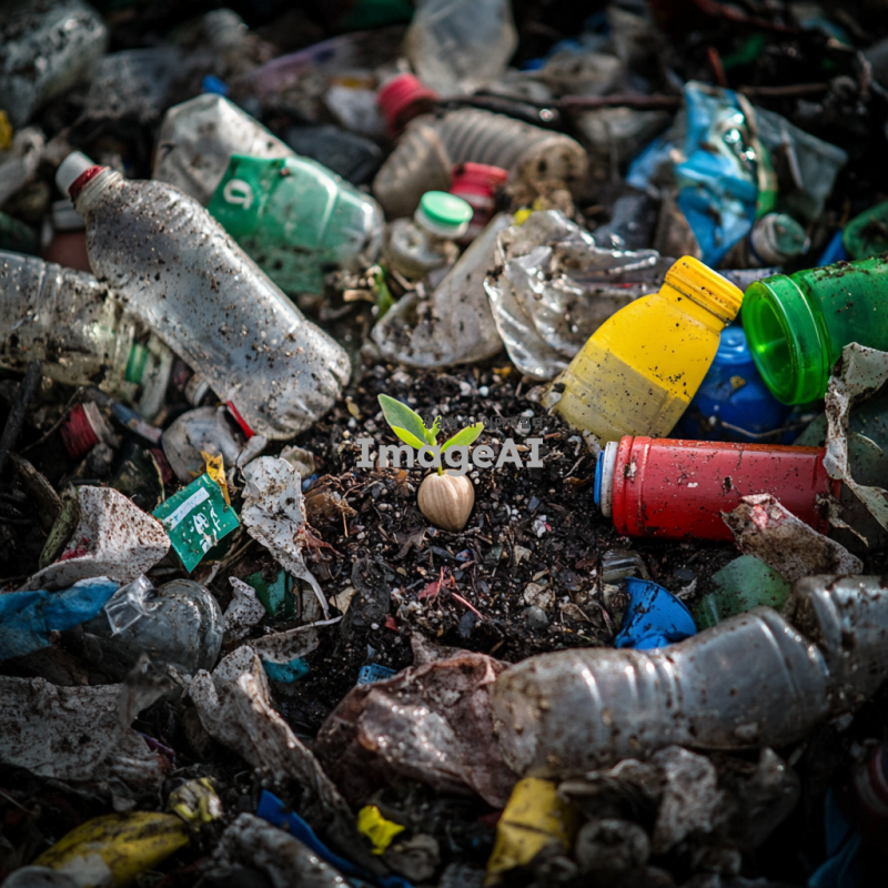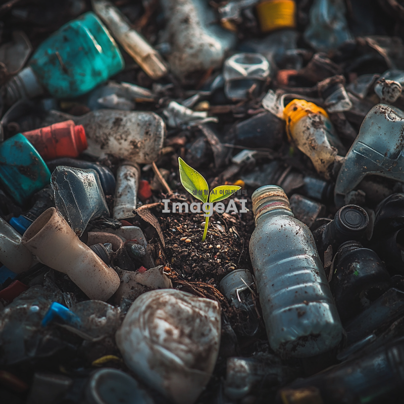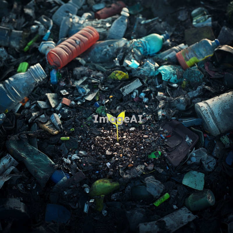 작은 씨앗이 쓰레기 더미 속에 묻혀 있는 장면, 씨앗 주변에는 다양한 크기와 모양의 플라스틱 조각과 유리병이 흩어져 있는 모습, 전체적으로 어두운 톤의 배경, 쓰레기 더미는 다양한 색상의 플라스틱과 유리로 구성되어 있으며, 씨앗은 작은 싹을 틔우고 있는 상태, 주변 환경은 약간 흐릿하게 표현하여 씨앗에 초점을 맞춘 장면.
