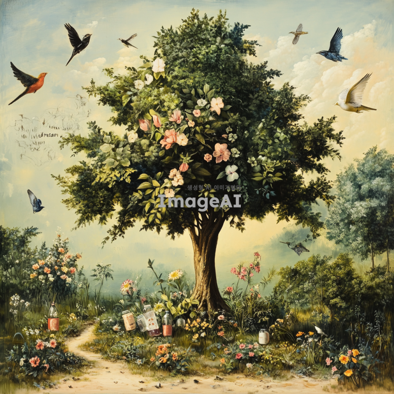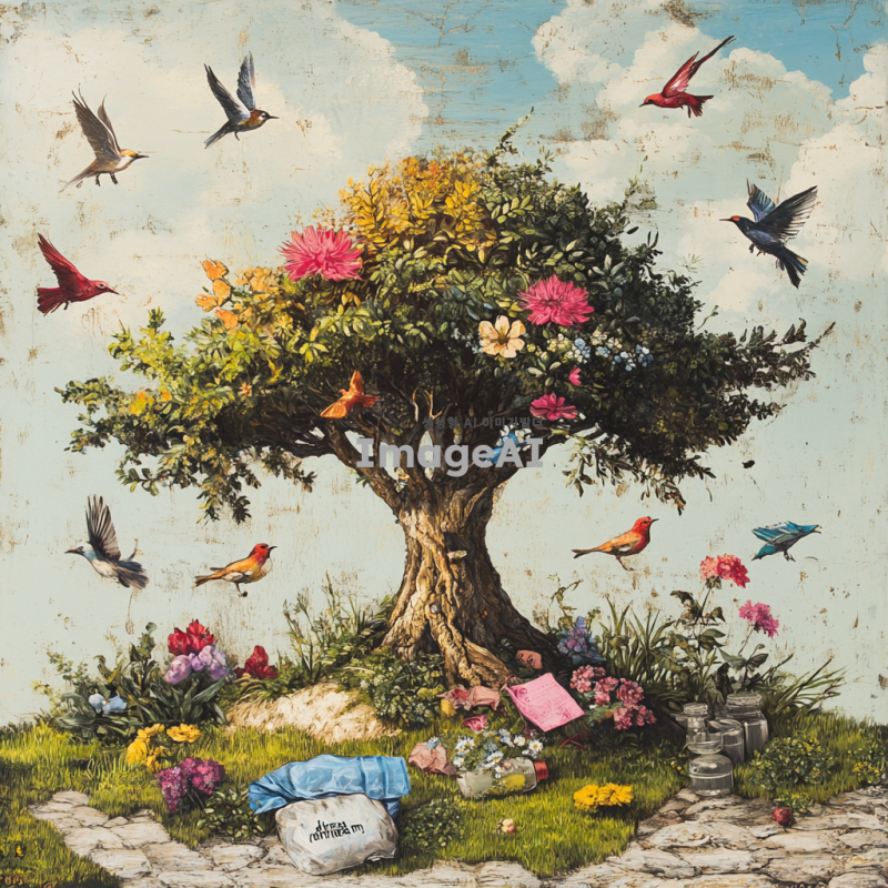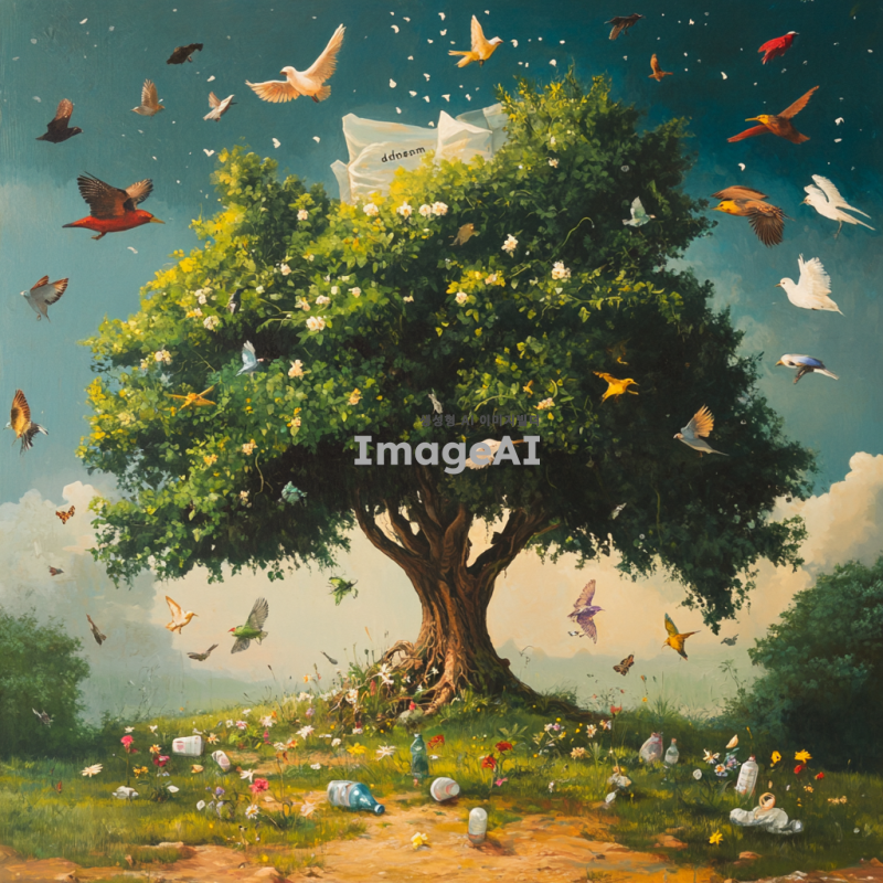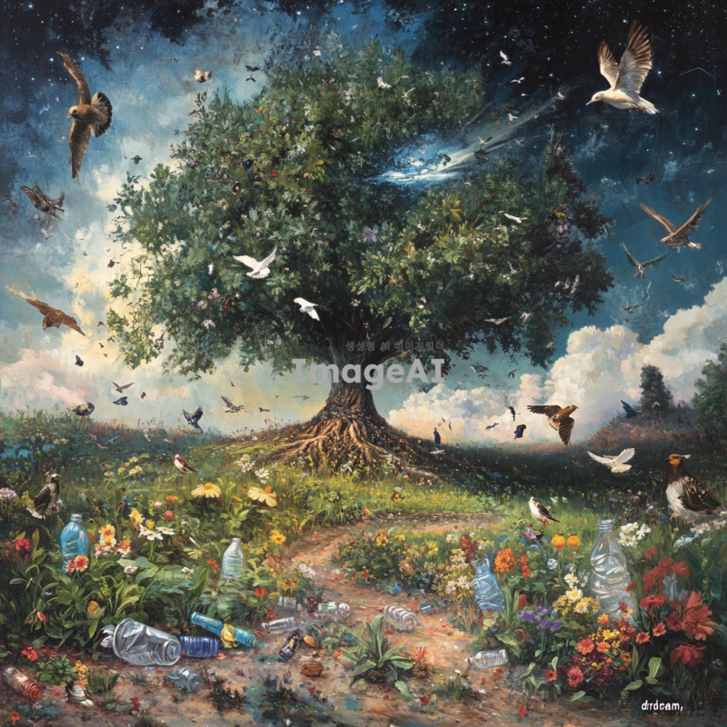 씨앗에서 커다란 나무가 자라나는 장면을 중심으로, 나무 주위로 다양한 새들이 날아다니며 자연의 풍요로움이 가득한 장면을 그려냅니다. 나무는 푸르고 건강하게 자라며, 주변에는 꽃과 풀이 어우러져 생명력이 넘치는 분위기를 연출합니다. 씨앗 위로는 "꿈"처럼 희미하게 떠오르는 이미지가 나타나며, 이는 마치 환상적인 장면처럼 부드럽고 신비롭게 표현됩니다. 대비되는 현실의 모습으로, 씨앗이 플라스틱 병과 비닐에 억눌려 자라지 못하는 장면을 그립니다. 씨앗은 자라지 못하고 주변의 인공적인 물질들에 의해 억제된 모습으로, 차갑고 무기력한 느낌을 주도록 표현합니다.